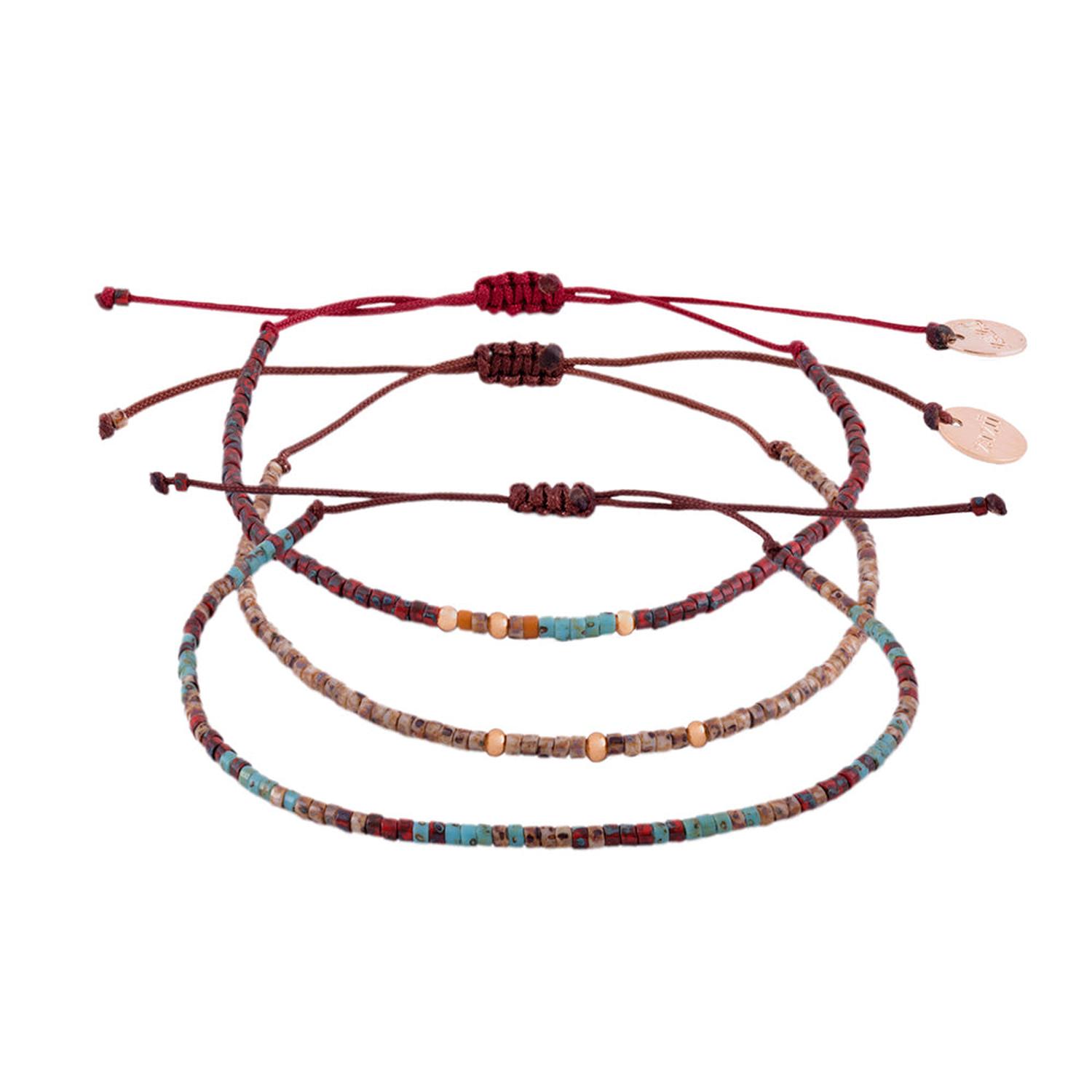 ¡listos para usar! este pack de pulseras es la combinación perfecta. nos encantan cómo se ven... y para que te luzcas, las combinamos para ti. cierre ajustable de macramé. materiales: mostacillas japonesas, mostacillas de plata bañadas en oro, hilo de nylon. los colores pueden variar levemente.