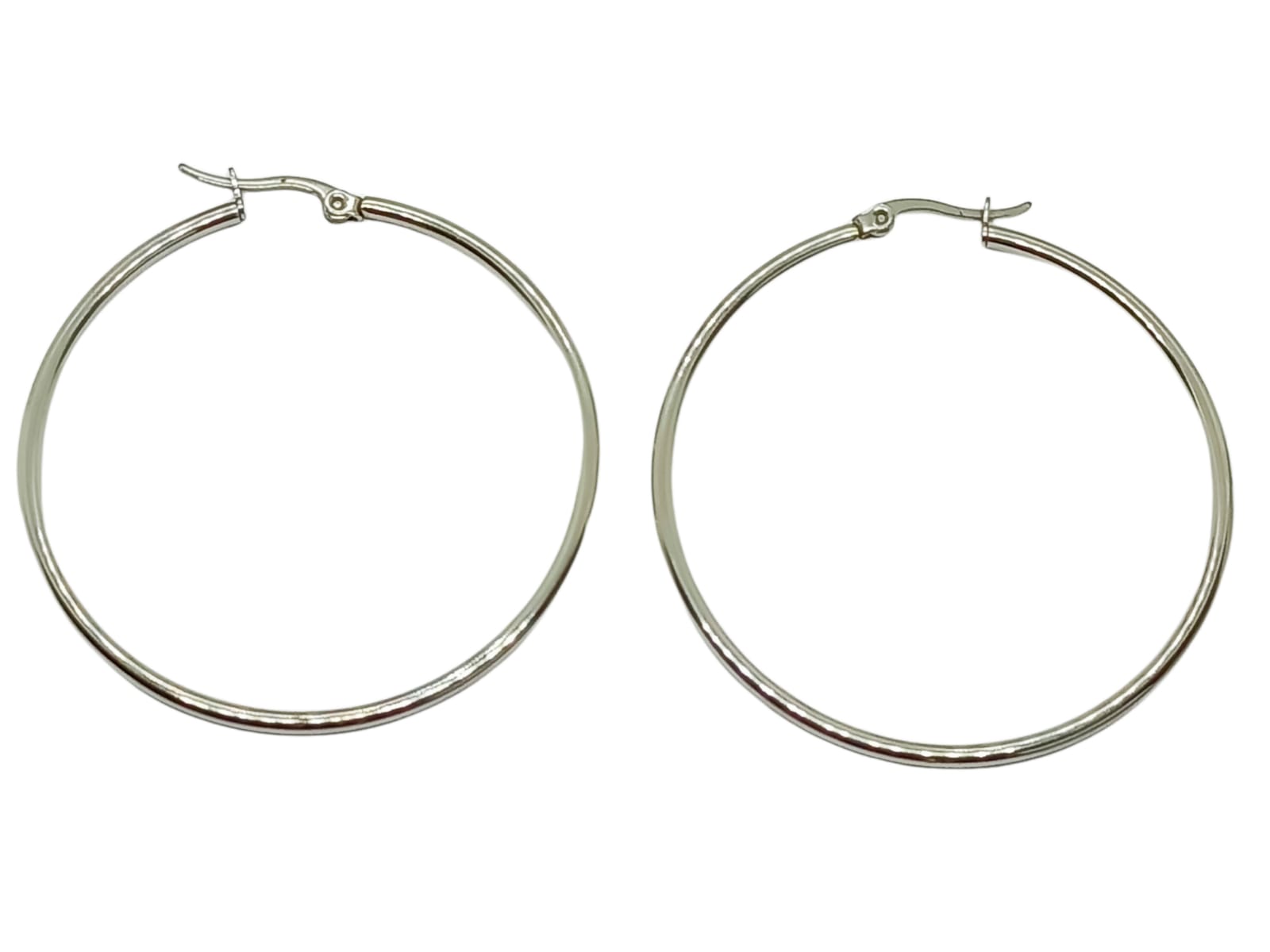 maxi argollas hoop fabricadas en acero inoxidable hipoalergénico. con un maxi diámetro externo de 50 mm y 45 mm de diametro interno, brillantes y súper livianas. ¡te aseguramos que te encantaran!