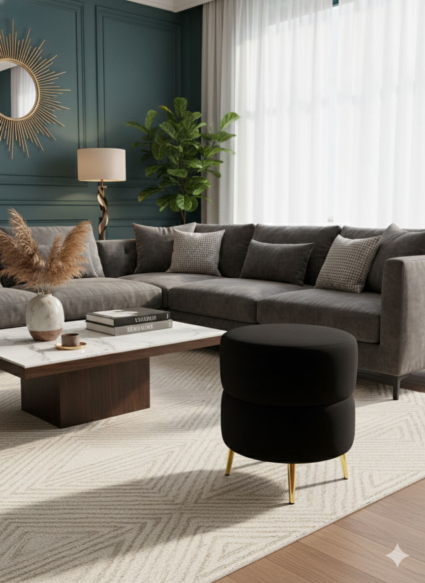 Muebles New - Puff Redondo Negro Felpa