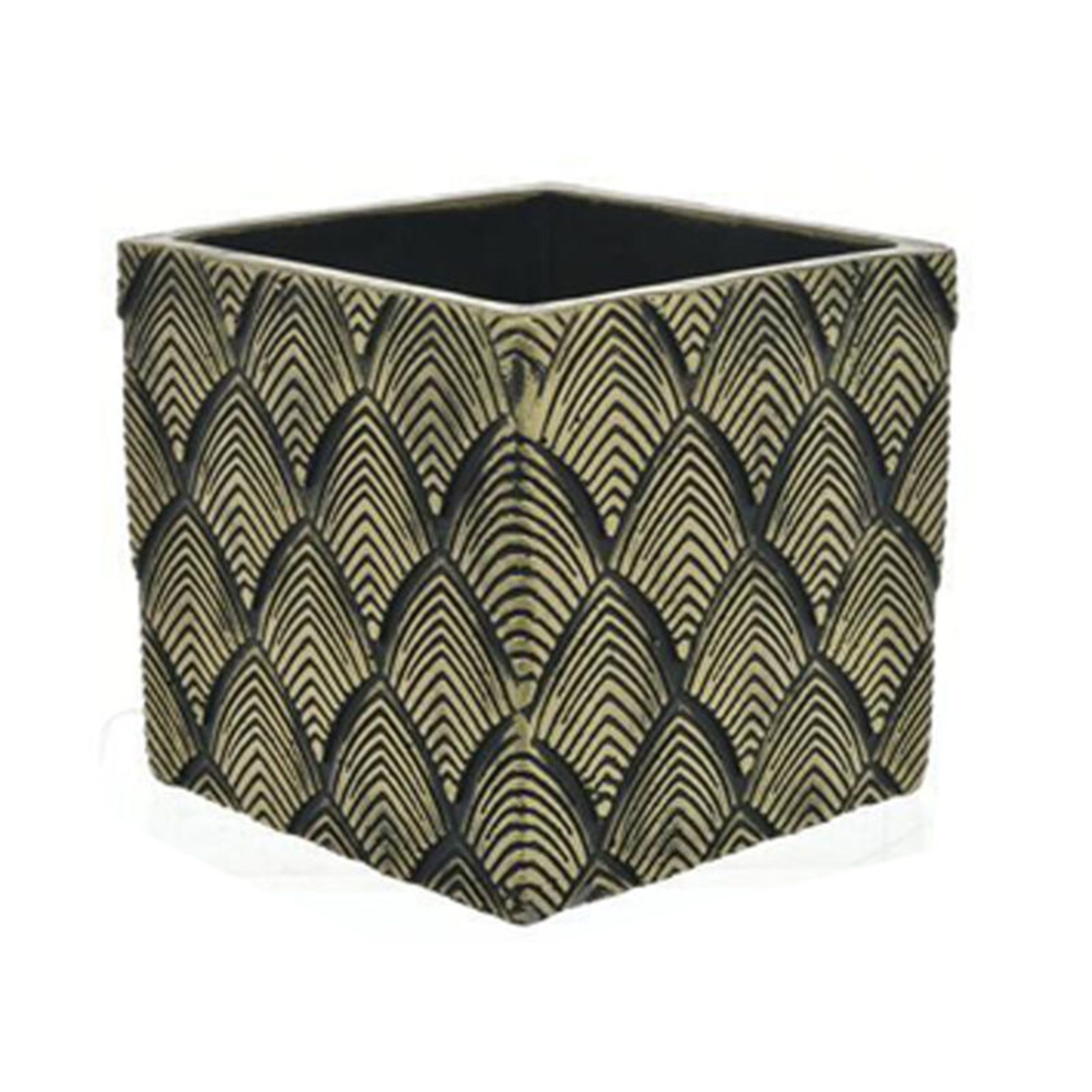Maceta decorativa malaui recta color negro con dorado, sus medidas son 13 centímetros de alto por 14 centímetros de ancho y 14 centímetros de largo, se compone de 100% cemento. con un diseño exclusivo, especial para decorar tú hogar con estilo, y además puedes ambientarla con nuestra otra maceta malaui.