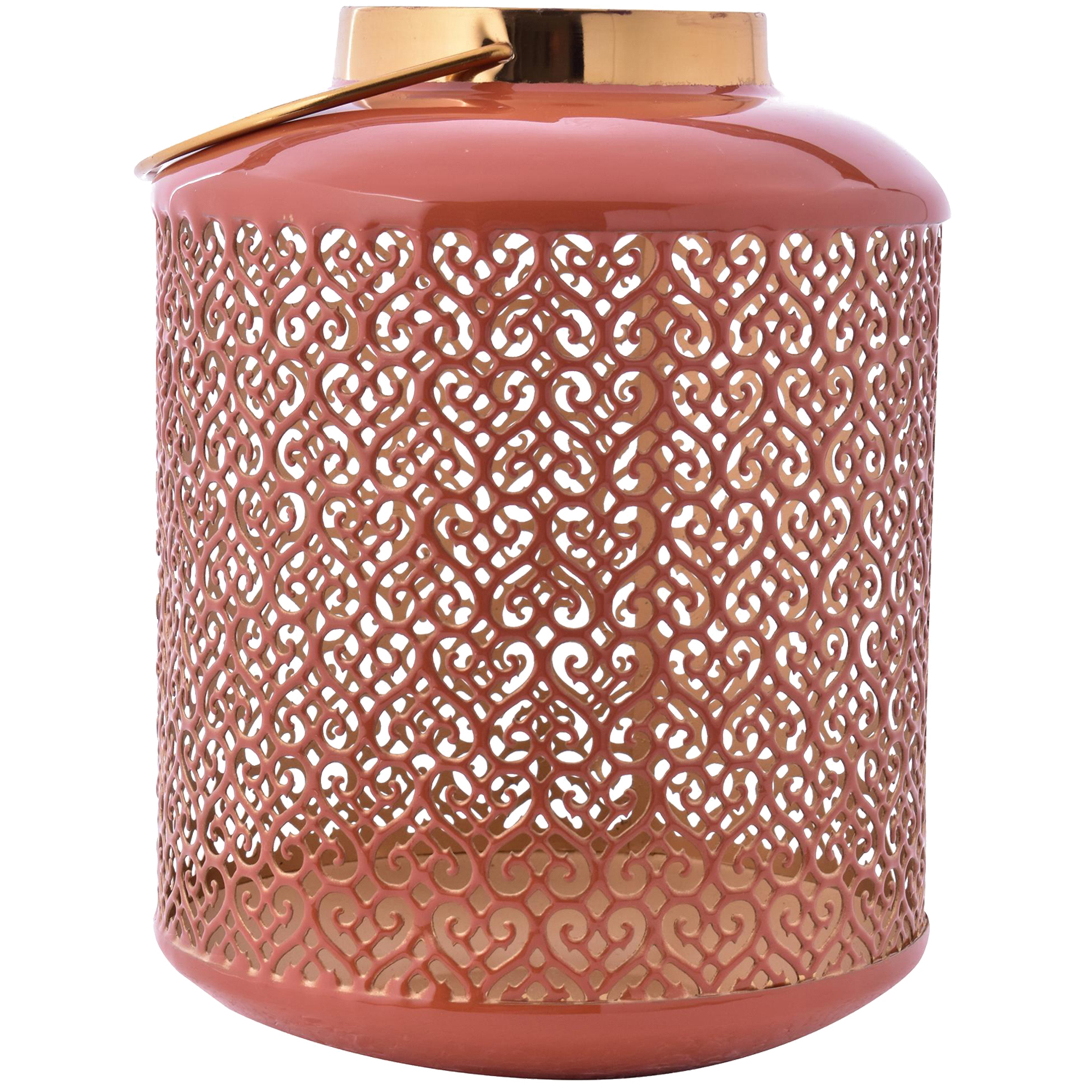 Fanal decorativo curazao palo rosa de color palo de rosa con dorado, sus medidas son 25 centímetros de alto por 19 centímetros de ancho y 19 centímetros de largo, se compone de 100% hierro. con un diseño exclusivo, especial para decorar tu hogar con estilo y además lo puedes ambientar con el fanal decorativo curazao mostaza.