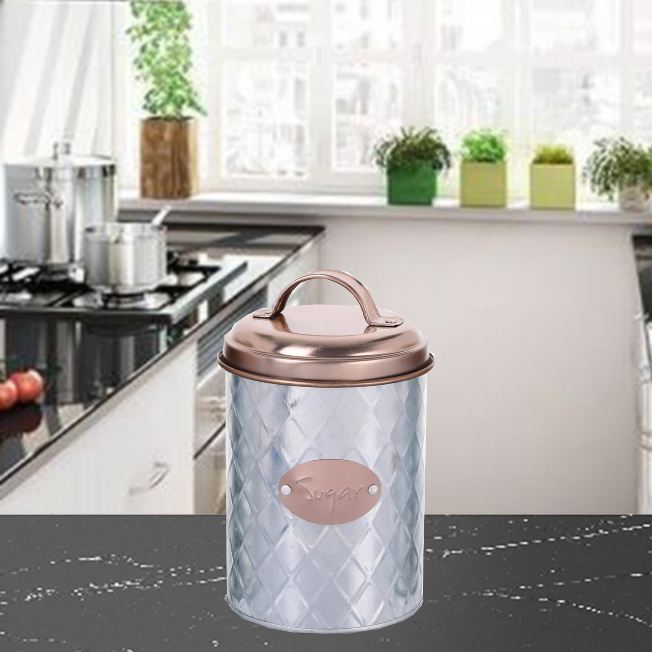 Envase decorativo para azúcar liverpool de color plateado con cobre, sus medidas son 18.5 centímetros de alto por 11 centímetros de ancho y 11 centímetros de largo. producto se compone de 100% acero. con un diseño exclusivo, especial para decorar tu hogar con estilo y puedes combinarlo comprando también los otros contenedores del mismo diseño.
