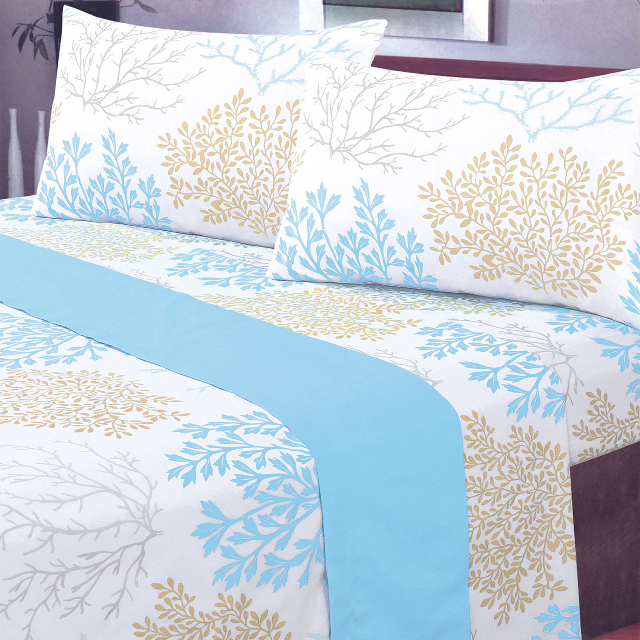 Juego de sábanas coral estampada plus 1 plaza de contextura 144 hilos de color blanco con turquesa y beige. juego incluye lo siguiente, 1 sábana superior de 140 x 255 centímetros, 1 sábana inferior ajustable para colchón de 90 x 200 + 30 centímetros, 1 funda de almohada de 45 x 90 + 5 centímetros, se compone de tela de contextura 144 hilos 50% algodón - 50% poliéster. con un diseño exclusivo, especial para decorar tu habitación con estilo. cuidados - no lavar o restregar a mano - no clorar - lavado temperatura máxima 20° - planchado temperatura máxima 20°