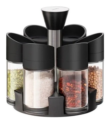 Articulo infaltable en tu mesa o cocina. este set de frascos de condimentos te permite organizar hasta 6 tipos diferentes de condimentos, su base giratoria otorga una gran comodidad a la hora de escoger el condimento que necesites.
