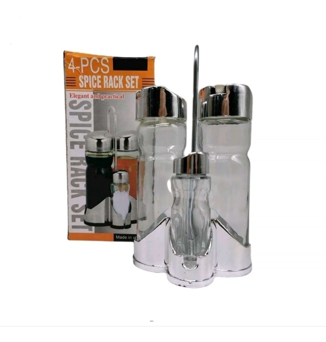 Descripción del producto: . el set de 5 piezas de alcuza clásica allegra esta confeccionado con botellas en vidrio, tapas metálicas con dispensadores, ideales para todas las celebraciones y uso común. - 2 botellas de 180 ml para líquidos. - 2 botellas de 40 ml para sólidos. - 1 pedestal metálico.