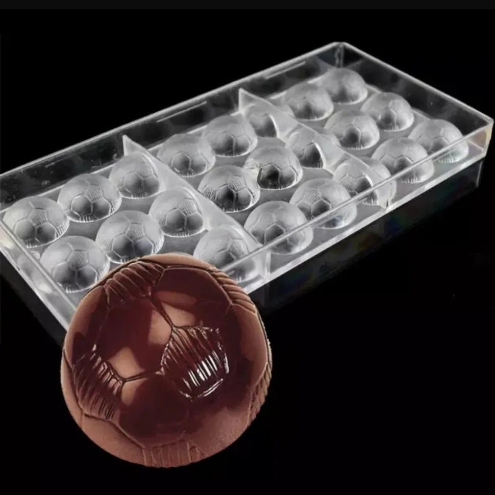 Molde para bombones de chocolate con forma de balón de fútbol - molde de policarbonato - medidas: 27,5x13,5cm - altura: 2,5cm. - diámetro: 3cm. - 24 compartimentos con forma de balón de futbol. - excelente molde para bombones que te sorprenderán con su forma original. - fácil limpieza y almacenamiento. -adecuado para la nevera y el congelador. - utiliza coberturas de chocolate negro, chocolate con leche, chocolate blanco para realizar estos bombones.