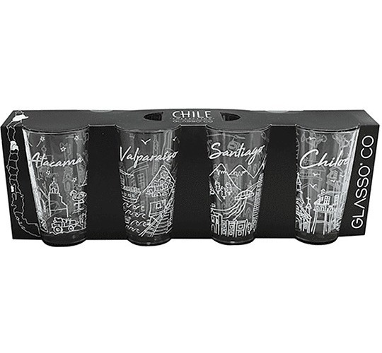 Descripción del producto glasso set 4 vasos chile collection contiene1 unidad de 4 vasos con diseño de chile. 1 unidades con diseño de la magia de atacama. 1 unidades con diseño de lo pintoresco de valparaíso. 1 unidades con diseño de la esencia de santiago. 1 unidades con diseño de el encanto de chiloé. glasso® co colección de vidrio y cristalería con orígenes en italia. cuentan con productos de alta calidad y elegancia. "queremos que te luzcas con tus invitados disfrutando nuestros productos o simplemente que te acompañen con estilo en tu vida diaria."