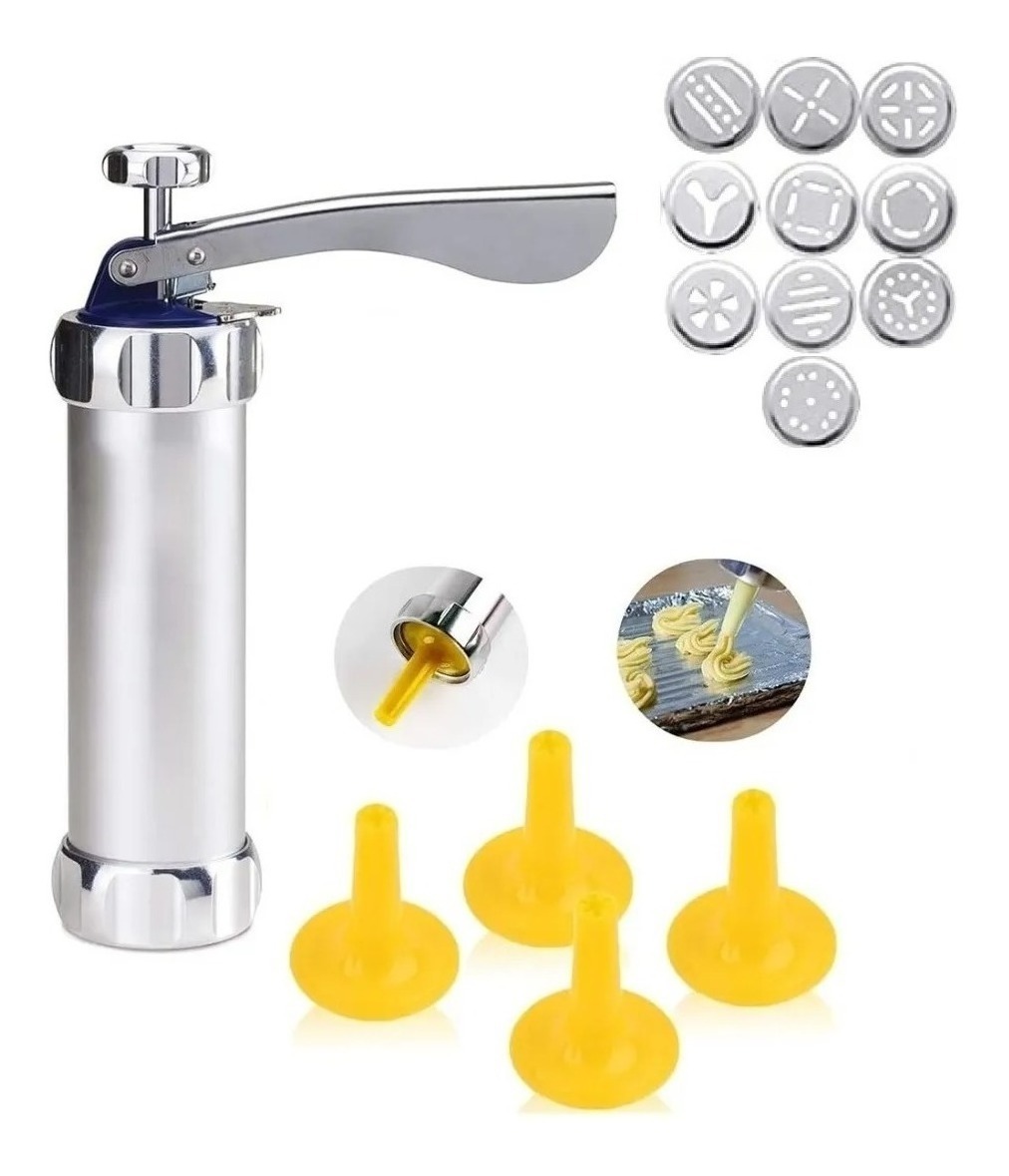 Excelente máquina para preparar galletas o rellenar churros de fácil uso. material de calidad nuestra prensa de galletas está bien hecha de acero inoxidable aprobado por la fda de grado alimenticio + aleación de aluminio (paletas circulares con figuras) + plástico pp (boquillas dispensadoras). el paquete incluye1 prensa de galletas, 10 formas de discos , 4 puntas de glaseado, manual y caja. fácil de usar prensa de galletas, simplemente retira la barra superior del émbolo, inserta el disco deseado, llena la masa y luego presiona las galletas. calidad de la tienda de pasteleríaestos discos de forma decorativa y consejos de glaseado te darán galletas caseras que parecen compradas en la tienda. disfruta de hornear sin complicaciones, haz múltiples lotes de galletas a la vez, lo que es ideal para fiestas de vacaciones, intercambio de galletas o regalos. contiene 10 modelos de galletas o biscuits y 4 boquillas para relleno o decoración.