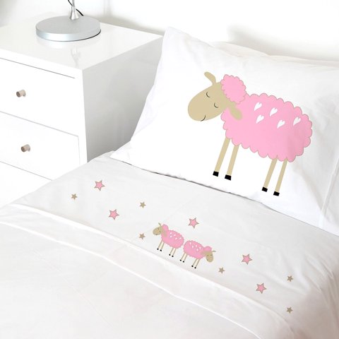 Juego sábanas 1.5 plazas 200 hilos Ovejita rosada blanco