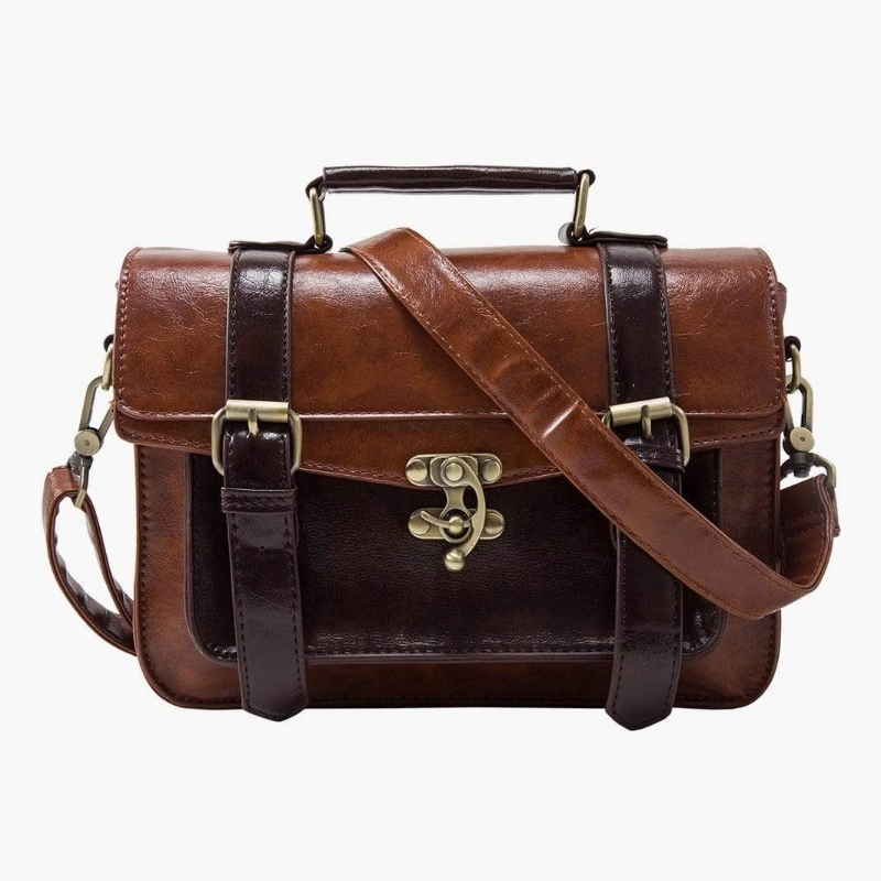 Maletín pequeño de cuero vegano para mujer. posee herrajes de metal vintage y forro de poliéster color canela