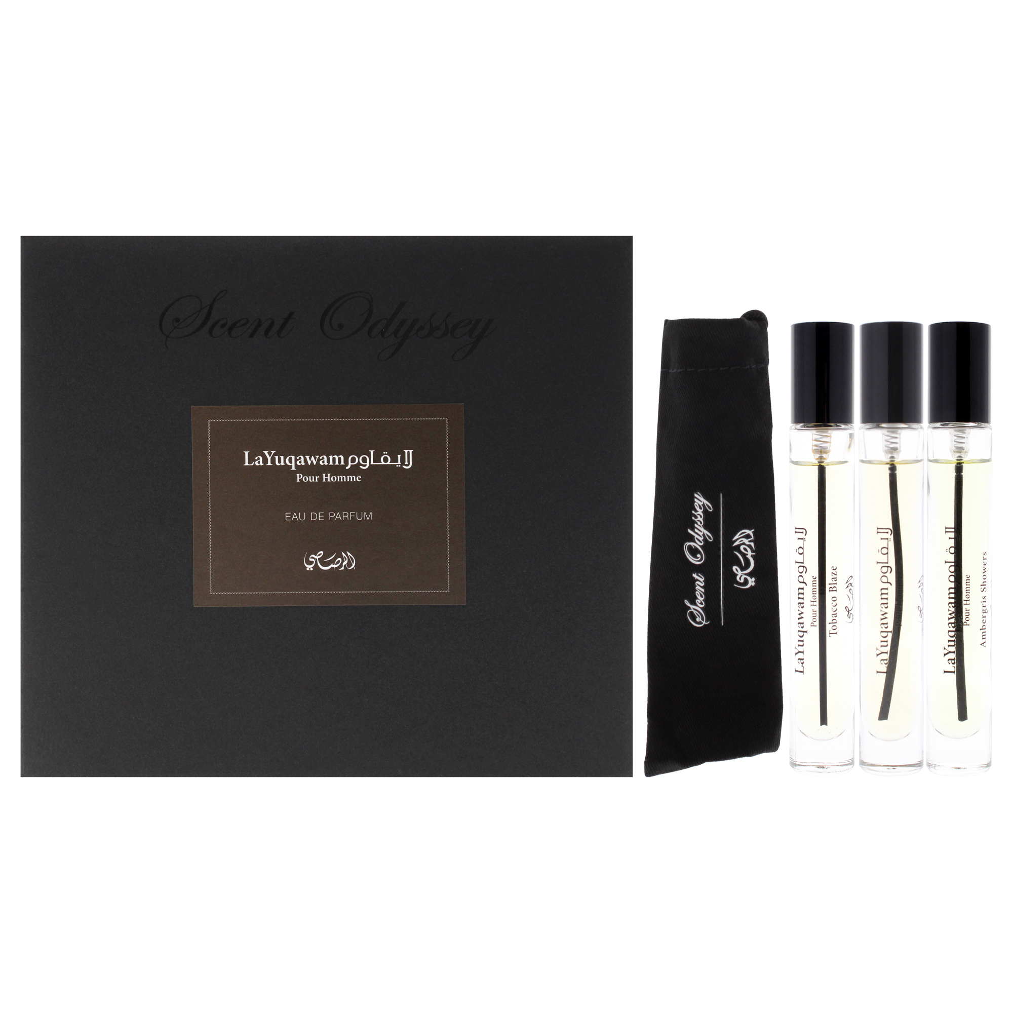 Set de regalo rasasi la yuqawam para hombre con tres fragancias en formato mini: la yuqawam pour homme edp 7.5ml, ambergris showers edp 7.5ml y tobacco blaze edp 7.5ml. ideal para quienes buscan variedad y calidad en perfumes masculinos.