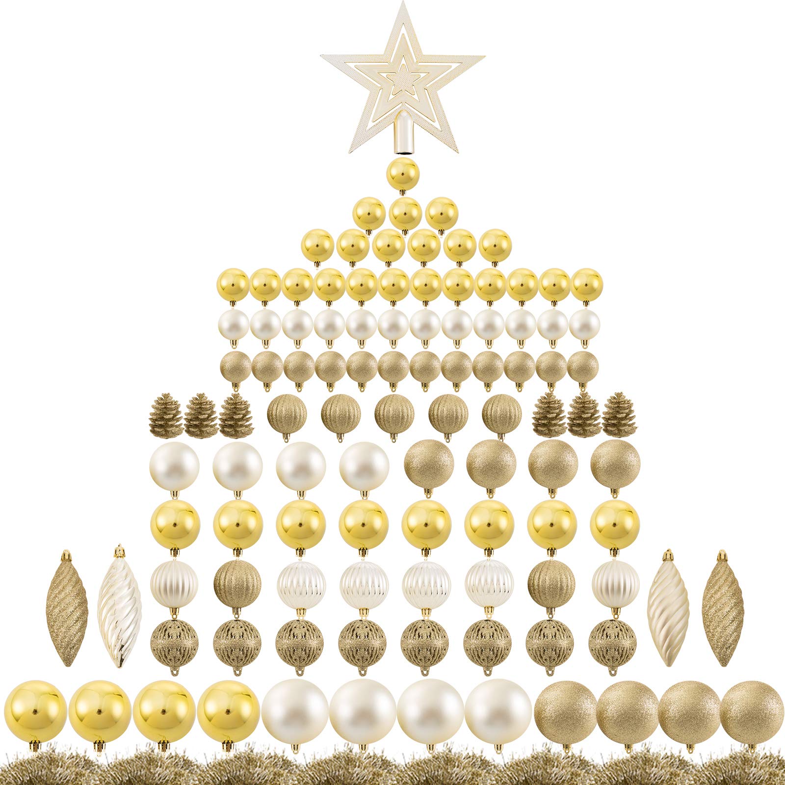 Tema clásico de decoración navideña: este juego de adornos es la manera perfecta de traer alegría navideña a tu hogar esta temporada de vacaciones. este juego de adornos atemporales seguramente le dará a tu árbol ese factor "sorpresa" y traerá el espíritu navideño a tu hogar. - tema clásico de decoración navideña: este juego de adornos es la manera perfecta de traer alegría navideña a tu hogar esta temporada de vacaciones. este juego de adornos atemporales seguramente le dará a tu árbol ese factor "sorpresa" y traerá el espíritu navideño a tu hogar. - 【resistente a las roturas】obtienes todo el aspecto y la sensación de costosos y hermosos adornos de navidad sin el peso pesado y peligro. estos adornos son de plástico resistente y resistente a los golpes que se mantiene en su lugar de forma segura con las cuerdas incluidas. - añade ese toque mágico a tu árbol: este juego de adornos tiene un gran tamaño universal y esquema de color para todo tipo de árboles diferentes. añade ese toque mágico al árbol de navidad de tu hogar con adornos reflectantes ligeros que brillan y brillan. crea alegría navideña en tu hogar con una decoración bellamente diseñada que querrás poner año tras año. - 【fácil de usar】cada uno de estos adornos viene con una cuerda para colgar para que puedas empezar a decorar directamente desde la caja. el paquete incluye 119 piezas de adornos surtidos para árbol de navidad. 3 estilos: purpurina, mate, brillante. 11 tipos de adornos de árboles.- - copa de árbol, cintas, bolas huecas, espiral, bolas, piñas. - adecuado para múltiples escenas de fiesta: tanto funcionales como hermosos, estos adornos serán el complemento perfecto para tu hogar durante la temporada de vacaciones. además, este juego de decoraciones también es adecuado para otras decoraciones diarias, como fiestas de cumpleaños o amigos, reuniones familiares. utiliza este divertido juego de decoraciones para crear una fiesta de navidad memorable