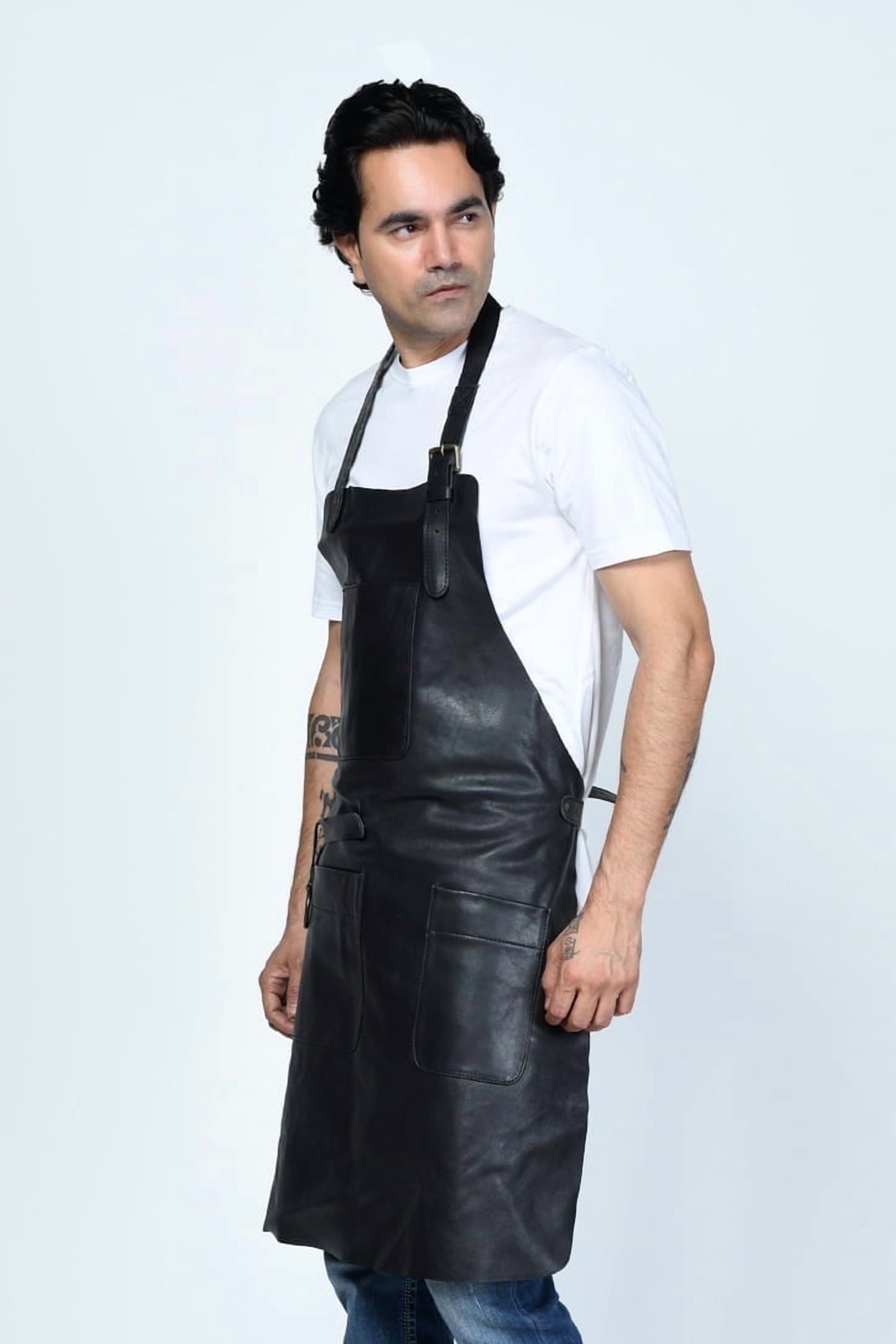 Delantal de cuero genuino con acabado encerado, diseñado para proteger tu ropa mientras trabajas. cuenta con múltiples bolsillos frontales ideales para herramientas pequeñas, pinceles y accesorios, combinando funcionalidad y estilo duradero para diversas actividades como carpintería, cocina, parrilla y más.