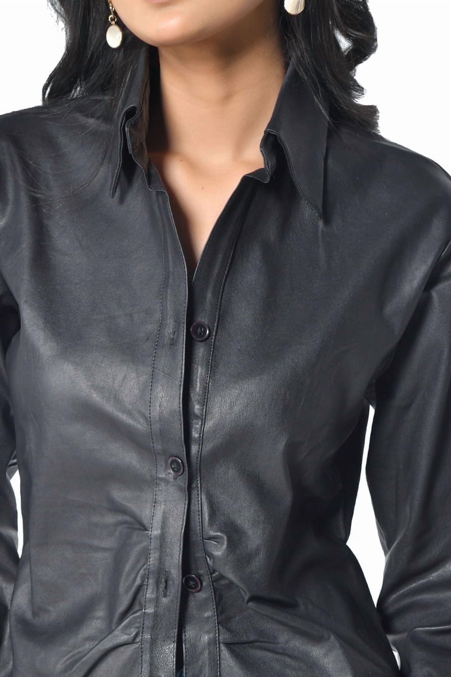 Camisa de cuero negra para mujer confeccionada en cuero de oveja elástico que combina estilo y comodidad. su cuello clásico aporta sofisticación, ideal para looks casuales y formales con un ajuste favorecedor y durabilidad para uso diario.