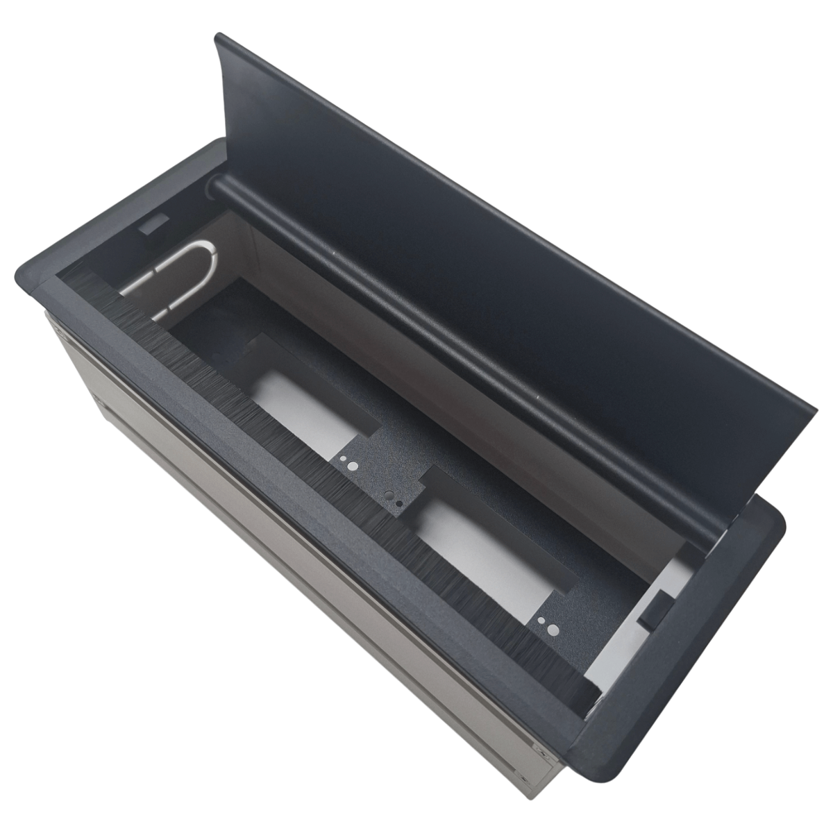 Caja para conexiones eléctricas box doble negro con 2 módulos, fabricada en aluminio y abs. tapa negra, cierre suave, burlete antipolvo y 4 troqueles para cables. ideal para escritorios y mesas de trabajo. no incluye módulos eléctricos.