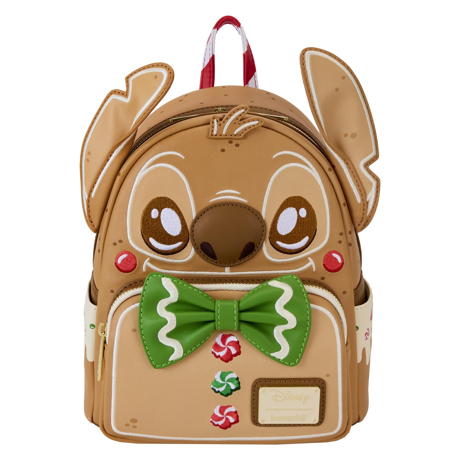 Loungefly disney lilo & stitch - mini mochila para cosplay - características: cuero vegano (poliuretano), acolchado, correas de hombro ajustables, asa superior y correa de color bastón de caramelo, paneles laterales, decorados con impresión de pan de jengibre, compartimento principal con cremallera, compartimento frontal con cremallera, herrajes de metal de color dorado, apliques, perfumados, bordados, grabados, arco 3d y detalles impresos, y forro interior coordinado. - dimensiones: 9"w x 10.5"h x 4.5"d - esta mochila es un producto oficial de disney.