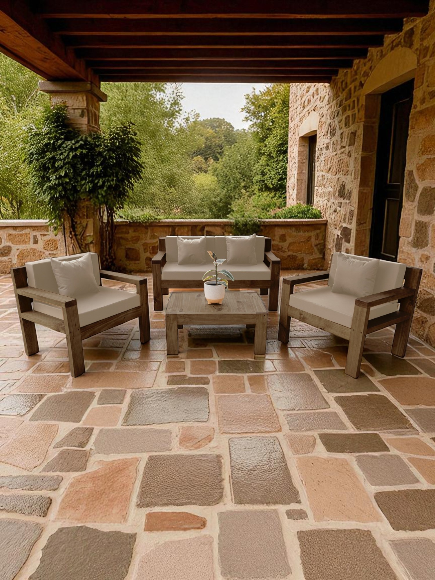 Terraza rústica miaruste modelo ambar 4 cuerpos color madera roble cojinería beige