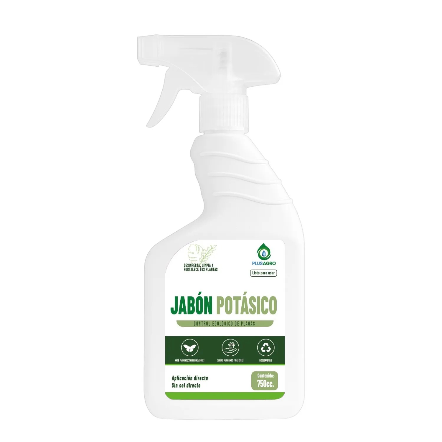 Jabón potásico ecológico 750 ml para control foliar natural de plagas. sin residuos tóxicos. aporta potasio y fortalece hojas en huertos y jardines.