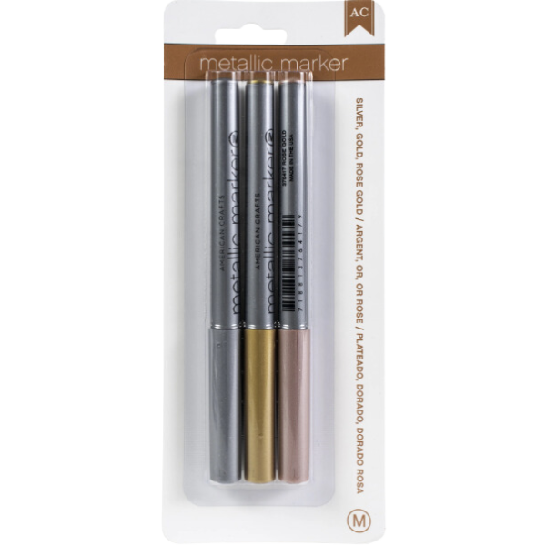 Estos marcadores metálicos son perfectos para papel oscuro y claro. este paquete de 7.6 x 19 x 1.27 cm. contiene tres marcadores metálicos en colores surtidos. no tóxico. sin ácido. fabricado en ee. uu.