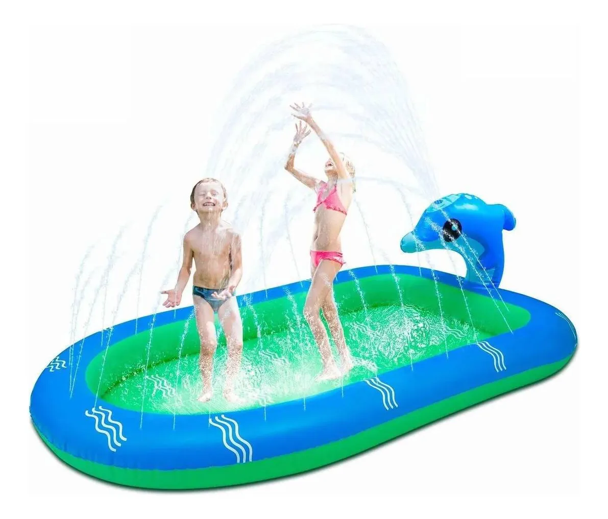 Piscina inflable con chorro de agua (170x110x45) lanza agua por los borde y el dino/delfín. capacidad 250 lts medidad 45 x 110 x 170 cm. diseñada por ser usada máximo por 2 niños siempre con supervisión de un adulto.