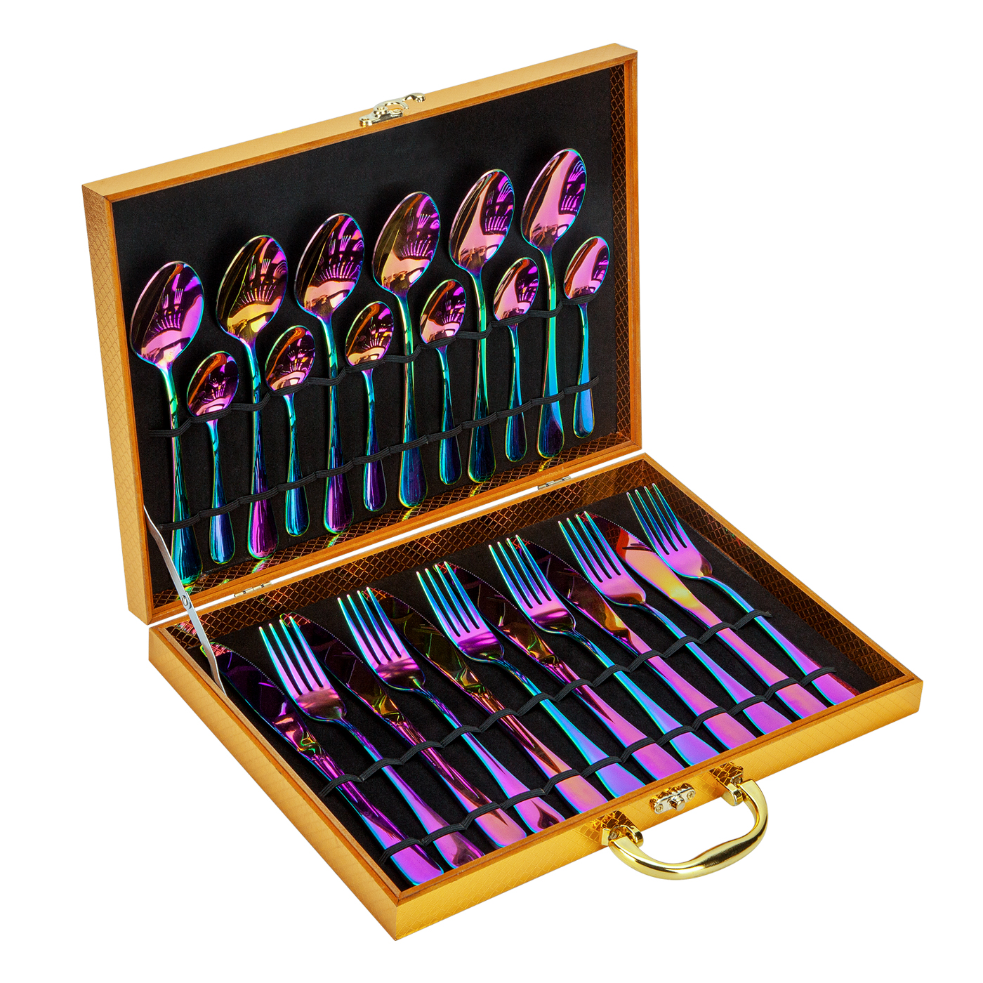 El juego de cubiertos incluye 6 pcs tenedores, 6 pcs cuchillos, 6 pcs cucharas de mesa y 6 pcs cucharas de té en una maleta de lujo.
