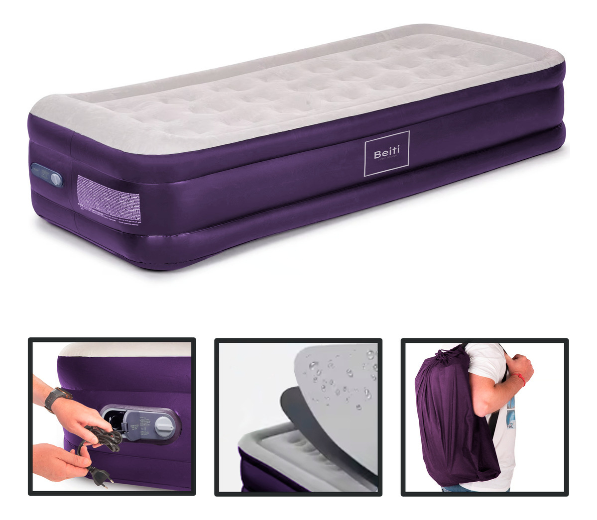 La clave para un sueño reparador está en el colchón. un aislante del frío, la humedad y que permitirá que tu cuerpo descanse en un material cómodo. perfecto para los invitados en tu casa, tus aventuras en la naturaleza o esas vacaciones donde necesitamos una cama extra. el colchón cama inflable single beiti, tiene un tamaño de dos plazas, una altura de cama elevada de 47 centímetros y un ancho de 97 centímetros. ideal para parejas o familias que busquen comodidad a la hora de dormir, siendo capaz de soportar un peso de hasta 150 kilos. para mayor suavidad, cuenta con una cubierta superior afelpada y un marco de soporte circundante superior e inferior que le otorga mayor estabilidad. vinilo de alta resistencia y durabilidad, el colchón cama inflable queen viene con un inflador eléctrico incoporado para inflado y desinflado (220 - 240 volt), además de su bolso de transporte para que puedas llevarlo e instalarlo donde quieras.