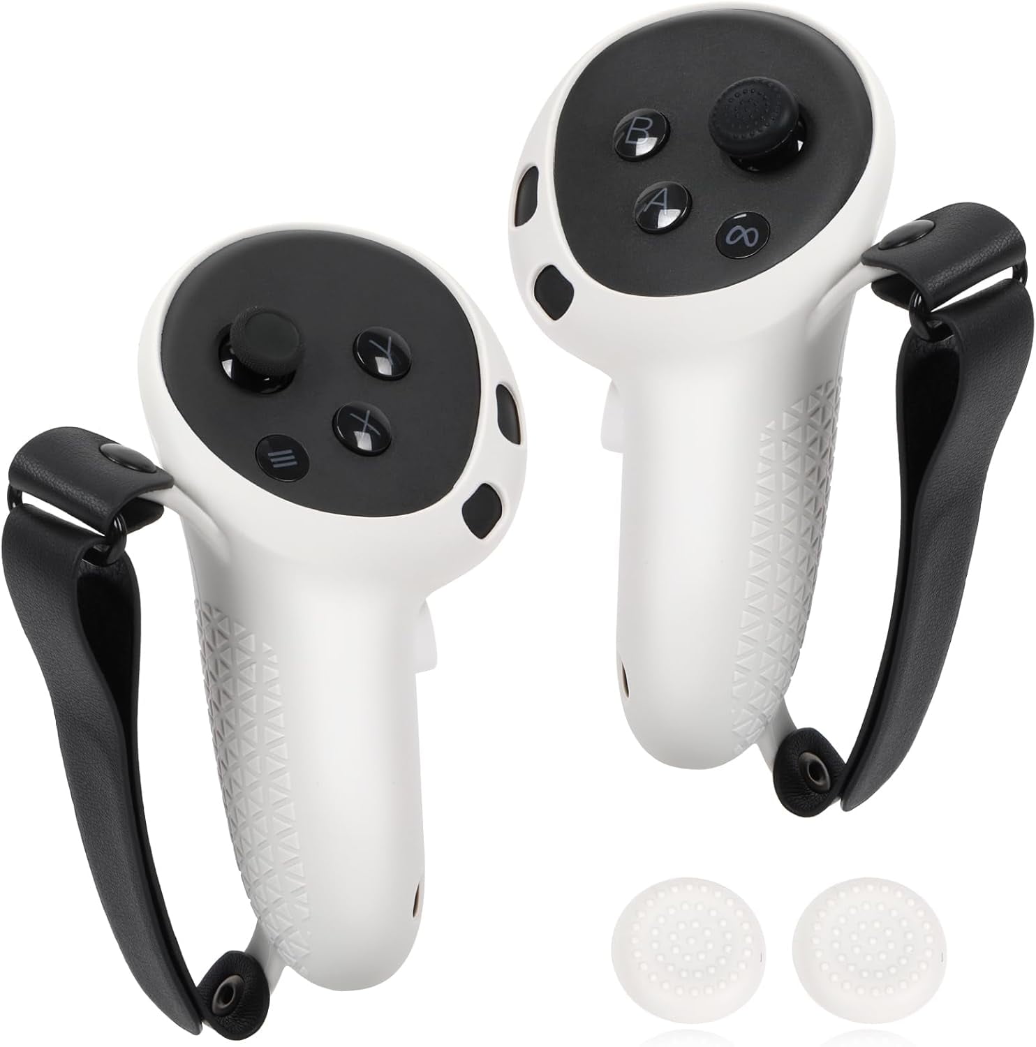 Funda de agarre diseñada para los controladores meta quest 3s y quest 3, con recortes precisos que aseguran un ajuste firme y estable. cuenta con correas ajustables de pu para mayor comodidad y un agarre antideslizante de silicona que mejora el control durante el juego.