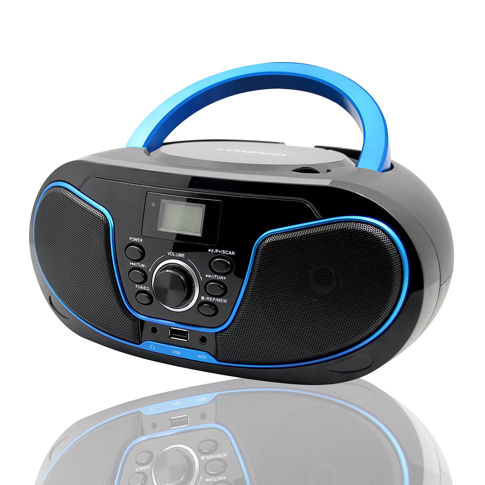 Disfruta de tus canciones favoritas de tu colección de cd y de las ondas de radio cuando te lleves a casa el reproductor de cd lonpoo con fm digital. este multifuncional la unidad es el complemento perfecto para tu mesita de noche y cuenta con un elegante acabado azul que seguramente complementará tu decoración actual. simplemente cárgalo con pilas de aire acondicionado y prepárate para bailar. ¡sube el volumen y saca todos tus viejos cd favoritos! usa la función fm digital integrada para navegar por los canales y disfrutar de tu cobertura favorita de música, entrevistas, noticias y deportes. preestablece tus emisoras favoritas para navegar de un canal a otro en cuestión de segundos. el asa integrada facilita el traslado de la unidad de una habitación a otra o incluso al patio trasero para una fiesta de baile al aire libre. reproductor de cd lonpoo boombox ♫ características: ▶ modelo de producto: reproductor de cd boombox lp-d02 ▶ tamaño del producto: 26 x 24 x 12 cm/10,3 x 9,4 x 4,8 pulgadas ▶ reproductor de cd/usb/entrada auxiliar, compatible con cd-r/cd-rw ▶ soporte de formatos de música: mp3, wma ▶ cinco modos de ecualización: rock/pop/flat/class/jazz. ▶ escaneo automático de fm, puede almacenar 20 estaciones como máximo. ▶ conector usb/aux/auriculares ▶ cd de carga superior ▶ pantalla lcd de pantalla completa ▶ botón de control digital electrónico, último o anterior ▶ perilla grande para volumen +/- ▶ función de parada automática y repetición de reproducción ▶ dc: pilas um-2 de 1,5 v dc* 4 piezas (no incluidas) ▶ cable de alimentación certificado por ul: 220 v/50 hz, 110 v/60 hz (número ul e329980) ▶ potencia de salida: 2 x 2 w ♫ el paquete incluye: 1 x boombox (batería no incluida) 1 x cable de alimentación certificado por ul 1 x línea aux 1 x manual de usuario * consejos: compruebe el formato de su disco antes de reproducir música. si necesita más ayuda, envíenos un correo electrónico, ¡gracias! (sales@lonpoo.com)