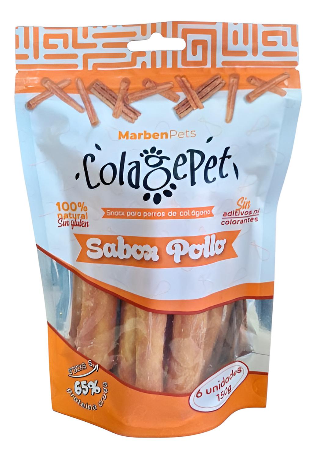 Colagepet snack para perros 100% natural talla s sabor pollo incluye: 1 colagepet. talla s. (sachet de 6u.) sabor: pollo medida: 12cm aproximadamente c/u. el snack colagepet de marben pets es un premio nutritivo y delicioso que cuida la salud de tu perro en cada bocado. elaborado con colágeno 100% natural, contribuye al fortalecimiento de sus articulaciones, mejora la elasticidad de la piel y mantiene su pelaje brillante. su textura no solo ofrece un entretenimiento duradero, sino que también ayuda a limpiar los dientes y reduce la acumulación de sarro de forma natural. fácil de digerir y sin aditivos, es el snack perfecto para todas las edades. este snack está enriquecido con colágeno natural, que contribuye a mantener la movilidad y flexibilidad de las articulaciones, siendo especialmente recomendado para perros adultos y mayores. beneficios principales: 1. enriquecido con colágeno, apoya la salud de articulaciones, huesos y tendones. 2. elaborado con pollo de alta calidad, fuente de proteínas magras. 3. ideal para perros adultos y mayores que necesitan cuidado articular. 4. mantiene movilidad y vitalidad diaria. 5. sin colorantes ni conservantes artificiales. notas importantes: 1. para perro de todos los tamaños, mayor a 3 meses. 2. no corresponde a un alimento completo. 3. prohibido su uso en la alimentación de rumiantes.