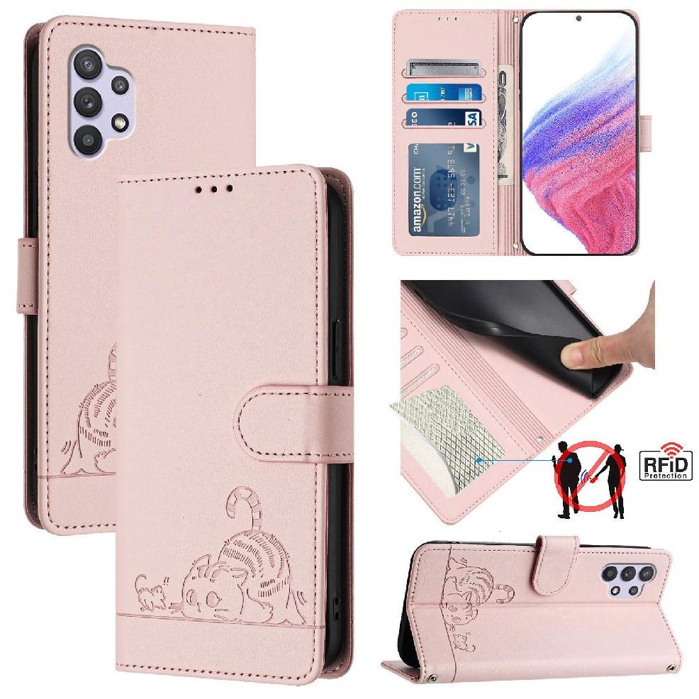 La funda tipo cartera foxdock para samsung galaxy a32 5g combina estilo, funcionalidad y protección en un accesorio elegante. con un divertido diseño de gato en relieve, incluye 3 ranuras para tarjetas, un bolsillo para billetes y tecnología de bloqueo rfid para proteger tu información personal. con correa de muñeca desmontable y soporte plegable integrado, ofrece un uso versátil tanto en casa como fuera. fabricada con cuero pu duradero y materiales absorbentes de impactos, esta funda es ideal para la protección y comodidad diaria.
