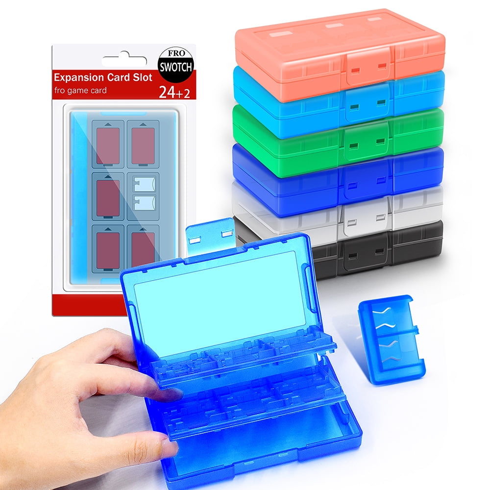 Estuche compacto para almacenar y proteger hasta 24 cartuchos de juego nintendo switch y 2 tarjetas micro sd. fabricado en plástico resistente que previene daños por caídas, luz fuerte y salpicaduras de agua.