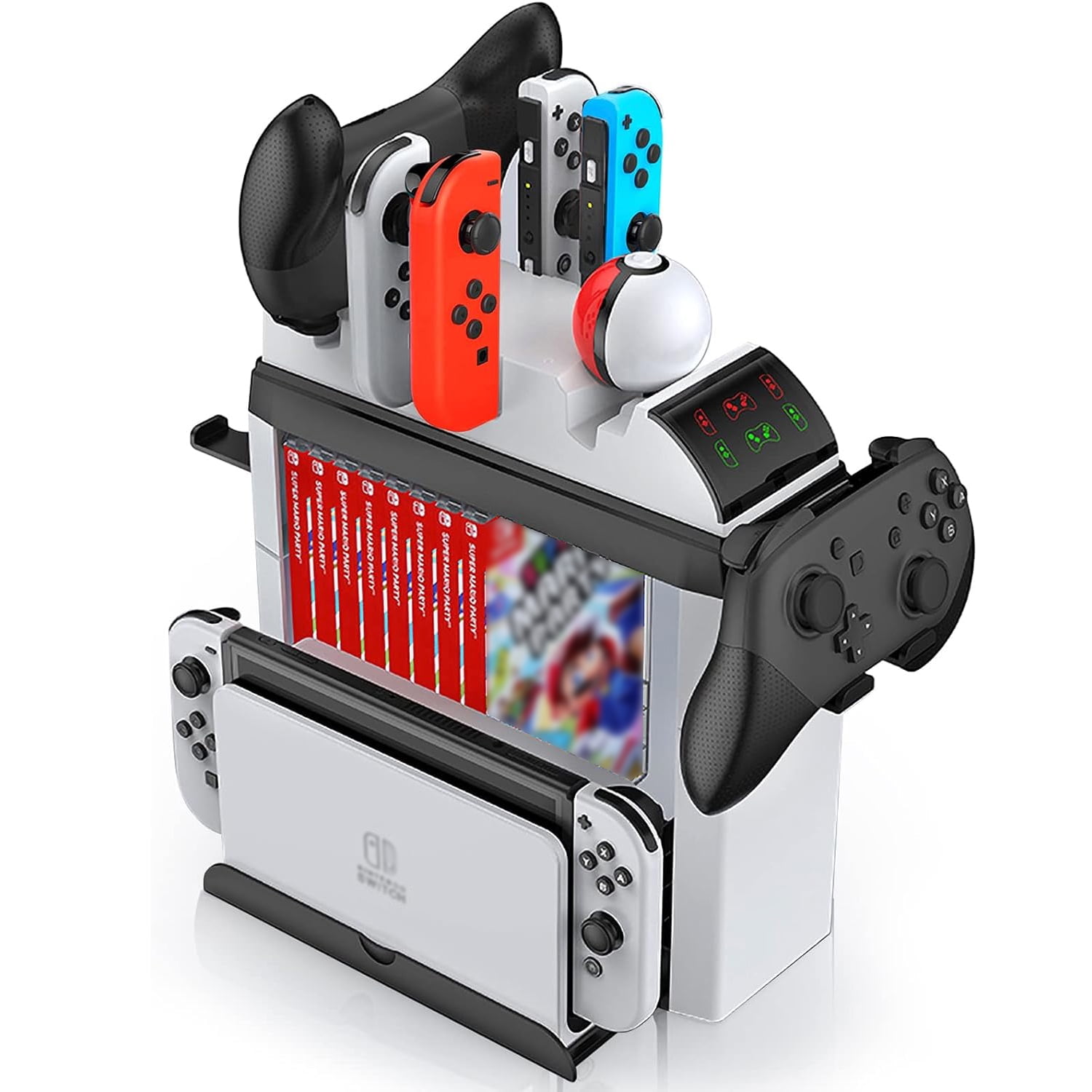 Soporte y base de carga multifuncional para nintendo switch y switch oled que permite almacenar hasta 15 estuches de juegos, 12 tarjetas, 2 controles y 1 base para tv. cuenta con carga rápida para 4 joy-cons y 2 controladores pro o 2 poke balls simultáneamente, con diseño en material abs blanco y ensamblaje sencillo.