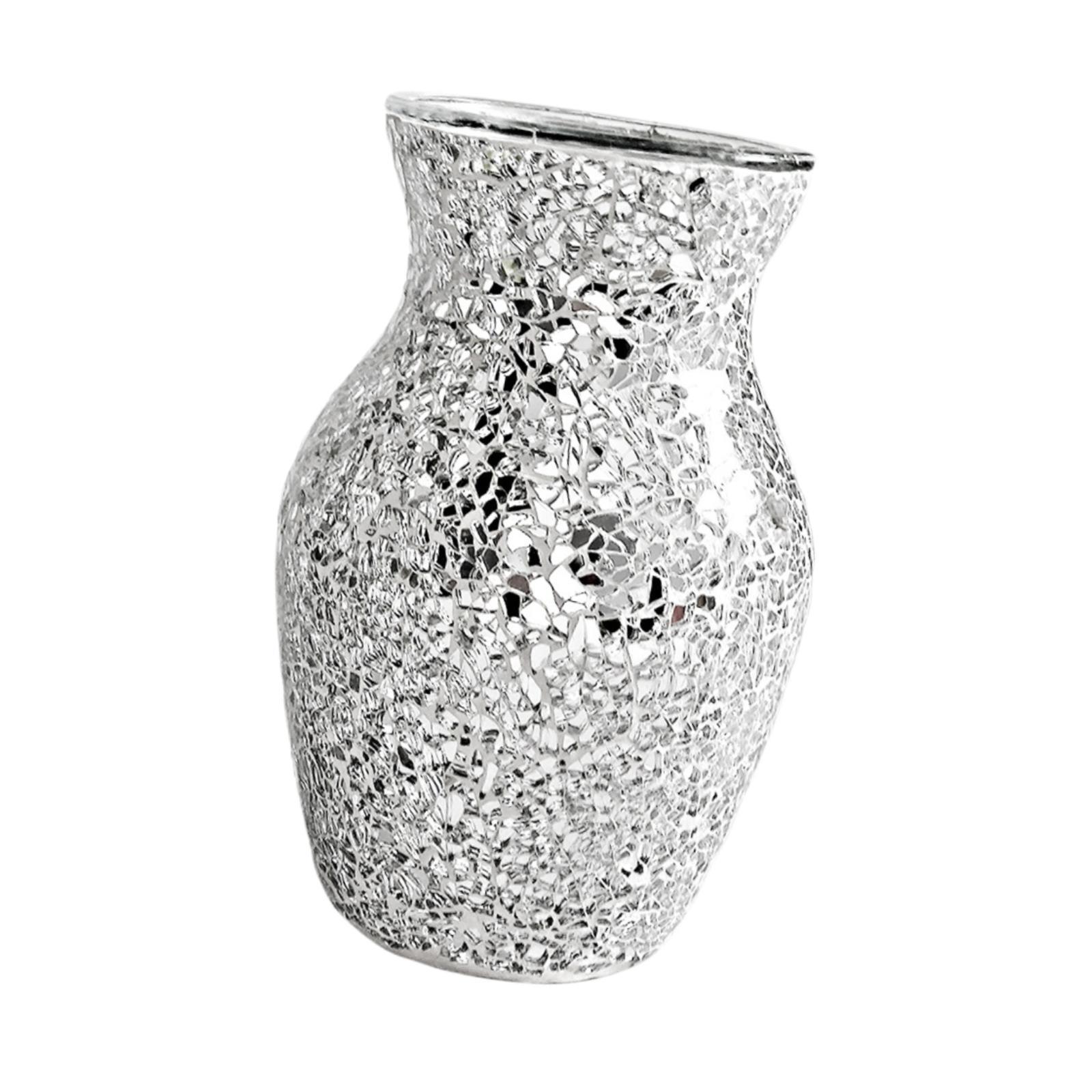 materiales seleccionados: este jarrón de mosaico de vidrio está hecho a mano con cientos de piezas de vidrio en tonos plateados. exhiba su estilo en cualquier mesa o estante y realce el diseño de su espacio interior.