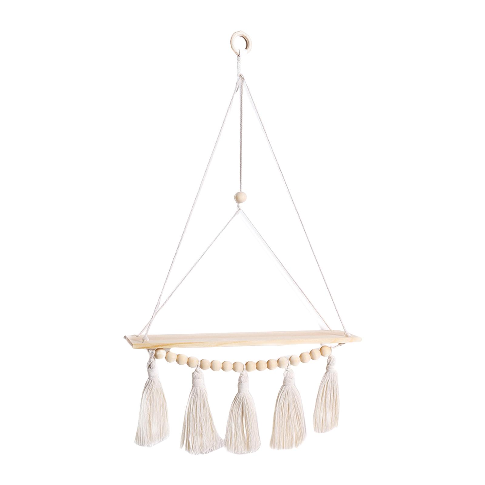 【estantes flotantes de macramé boho】 la parte inferior de los estantes flotantes está decorada con cuentas de madera y múltiples borlas, y el color claro puede combinar fácilmente con una variedad de estilos de decoración.