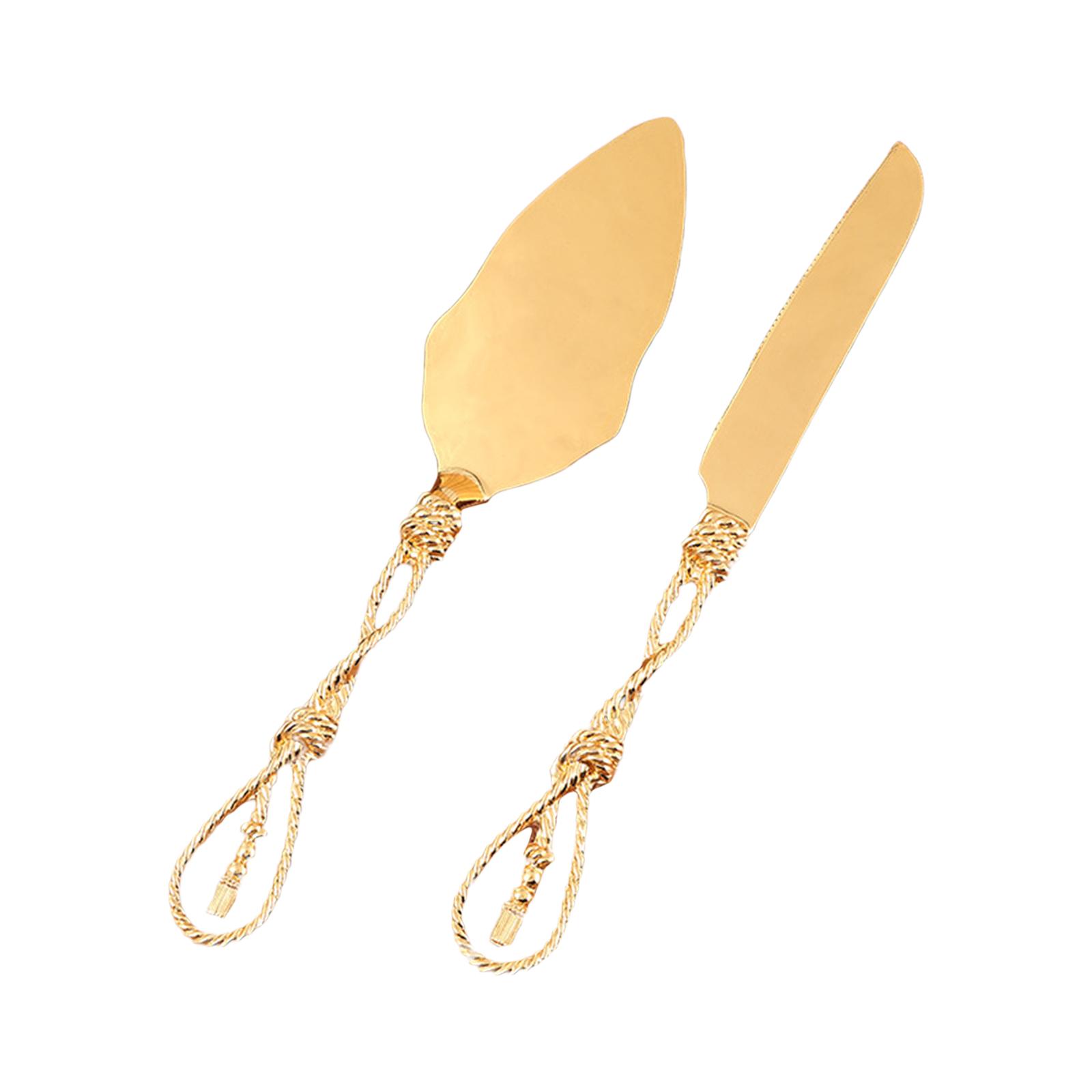 estilo moderno y elegante: los mangos dorados agregan sofisticación tanto al cortador de pasteles como a la pala de este juego para servir pasteles de boda.