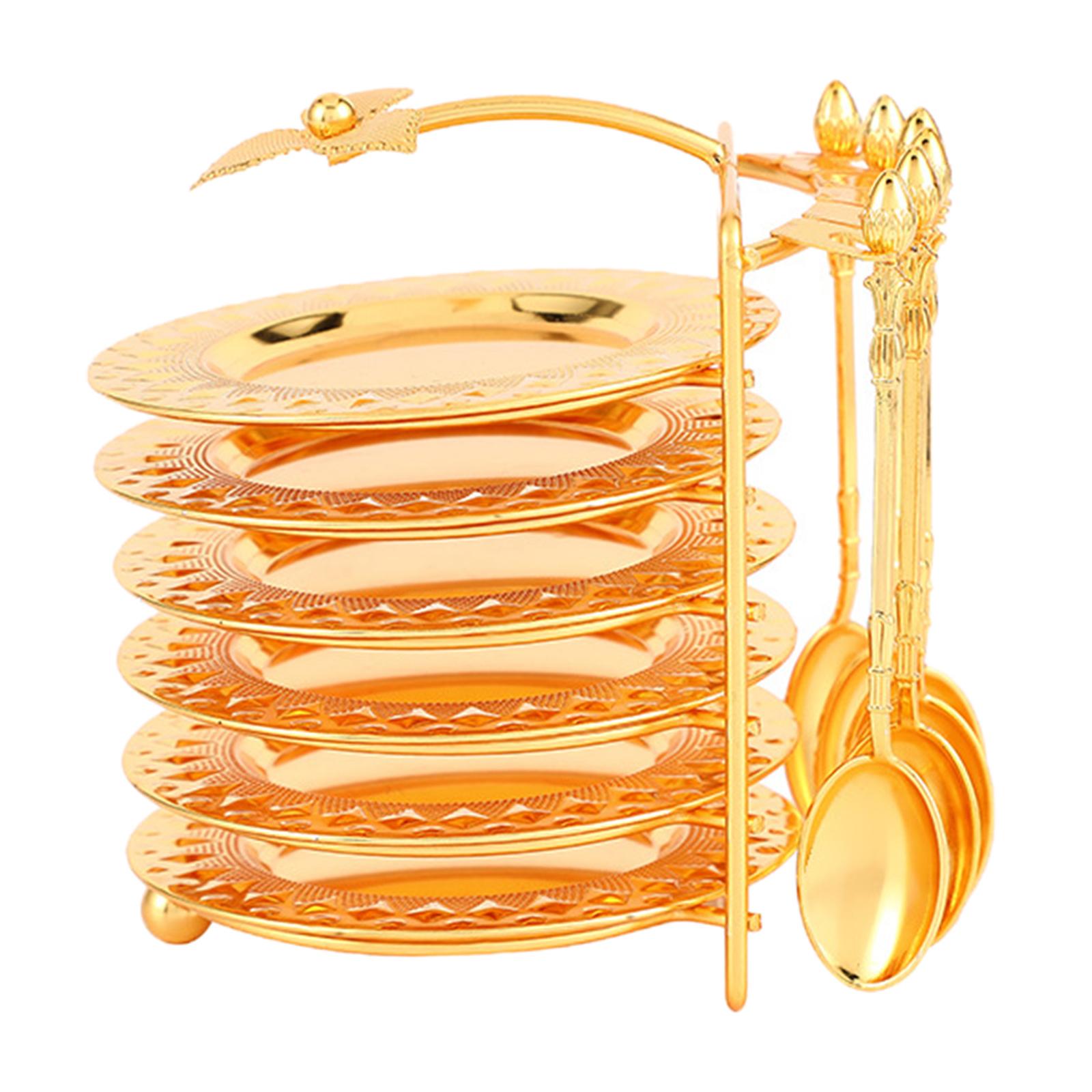 Juego de vajilla completamente seguro y práctico: el juego contiene seis platos llanos de 4.29 pulgadas, seis cucharas y un estante de almacenamiento, el acabado chapado en oro lo hace excepcionalmente elegante y funcional en una variedad de contextos.