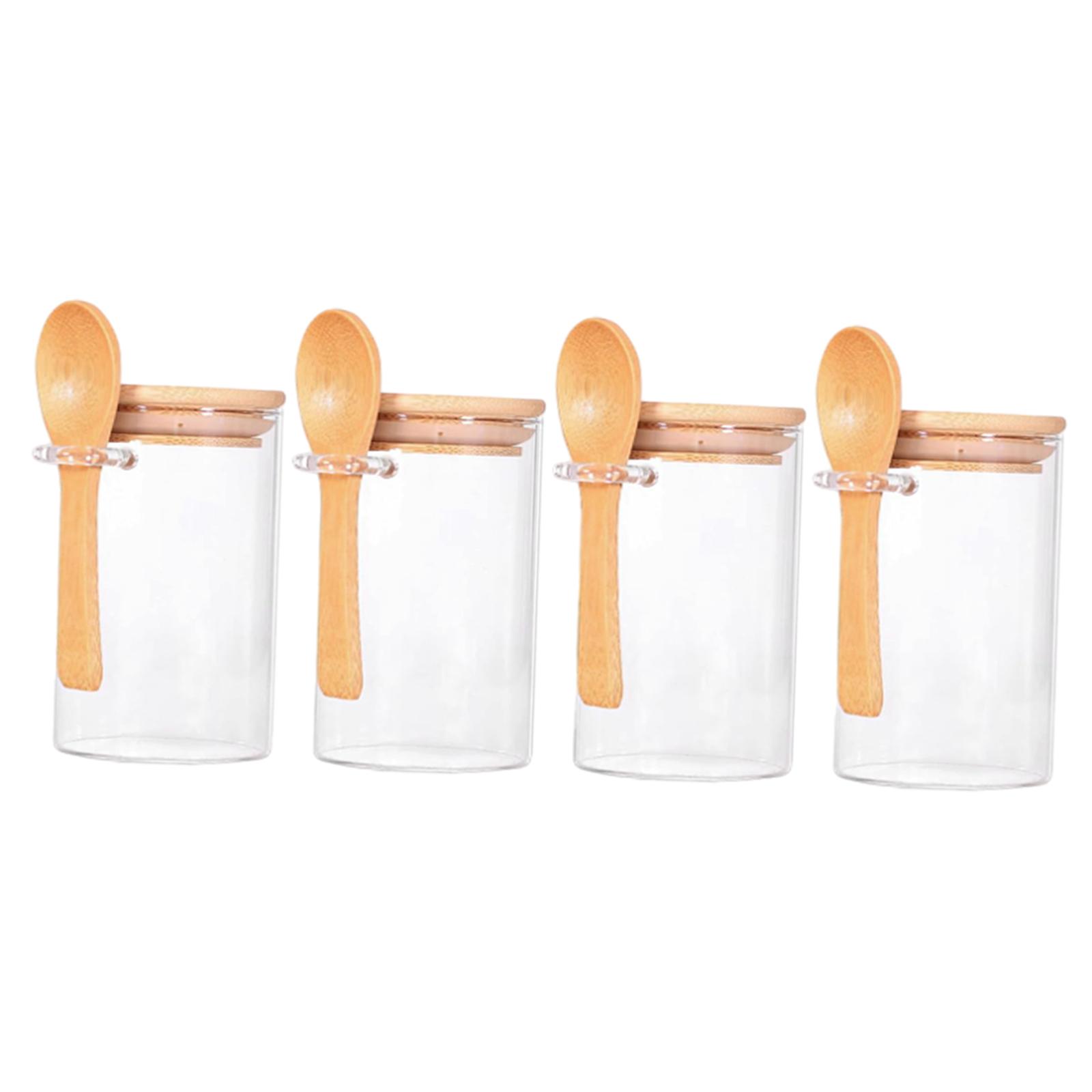 el paquete incluye: 4 recipientes de vidrio con tapa hermética de bambú y cuchara de madera. los recipientes de vidrio transparente son absolutamente buenos accesorios de almacenamiento para los hogares.