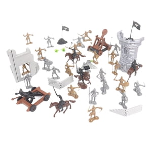 el juego incluye: 12 soldados dorados, 12 soldados plateados, 1 vehículo de catapultas, 1 balista, 4 caballos, 4 caballería.