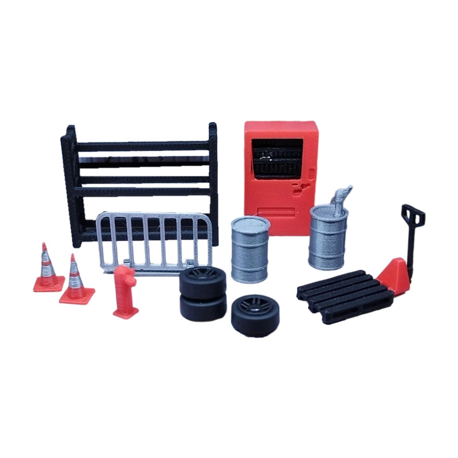 【juego completo de 13 piezas】: incluye una variedad de herramientas que incluyen bidones de aceite, bastidores, neumáticos, conos de tráfico, remolque manual, etc. para completar la configuración de su taller en miniatura