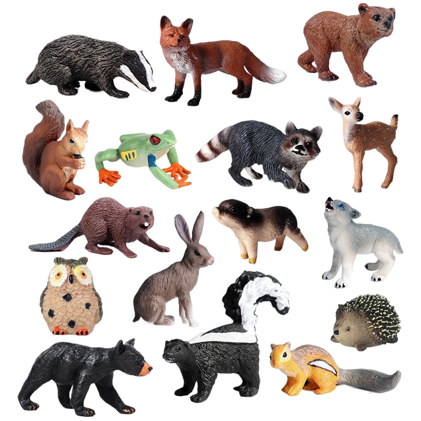 16 figuras de animales del bosque salvaje: incluye búho, ardilla, ardilla listada, conejo, tejón, mofeta, mapache, oso negro, oso pardo, rojo, rana arborícola de ojos rojos, lechón, lobo, venado de cola blanca, erizo.