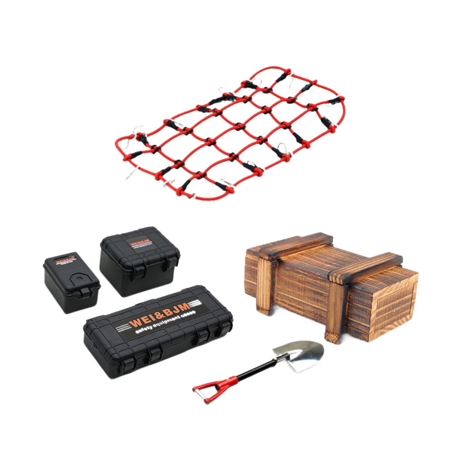 【función】: la decoración del techo del automóvil rc crawler incluye un estuche para equipaje, una caja de madera, una pala y una red para equipaje rc.