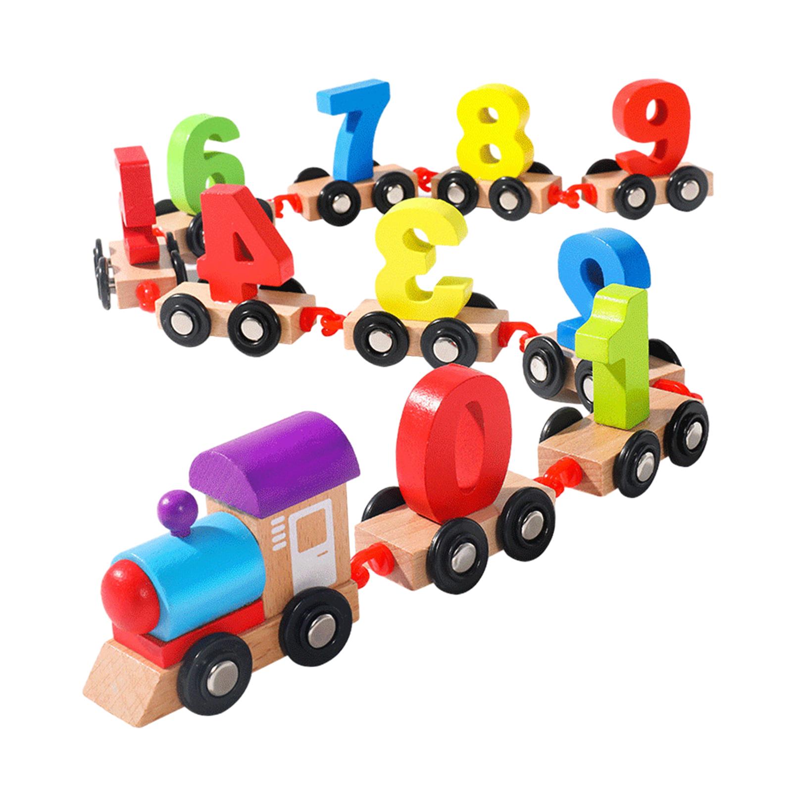【juego de trenes con números de madera】: el juego de trenes de madera con colores brillantes consta de un número y una cabeza de tren, cada cuerpo de tren es individual y está conectado mediante imanes. cada tren tiene 4 ruedas deslizantes que se deslizan fácilmente.