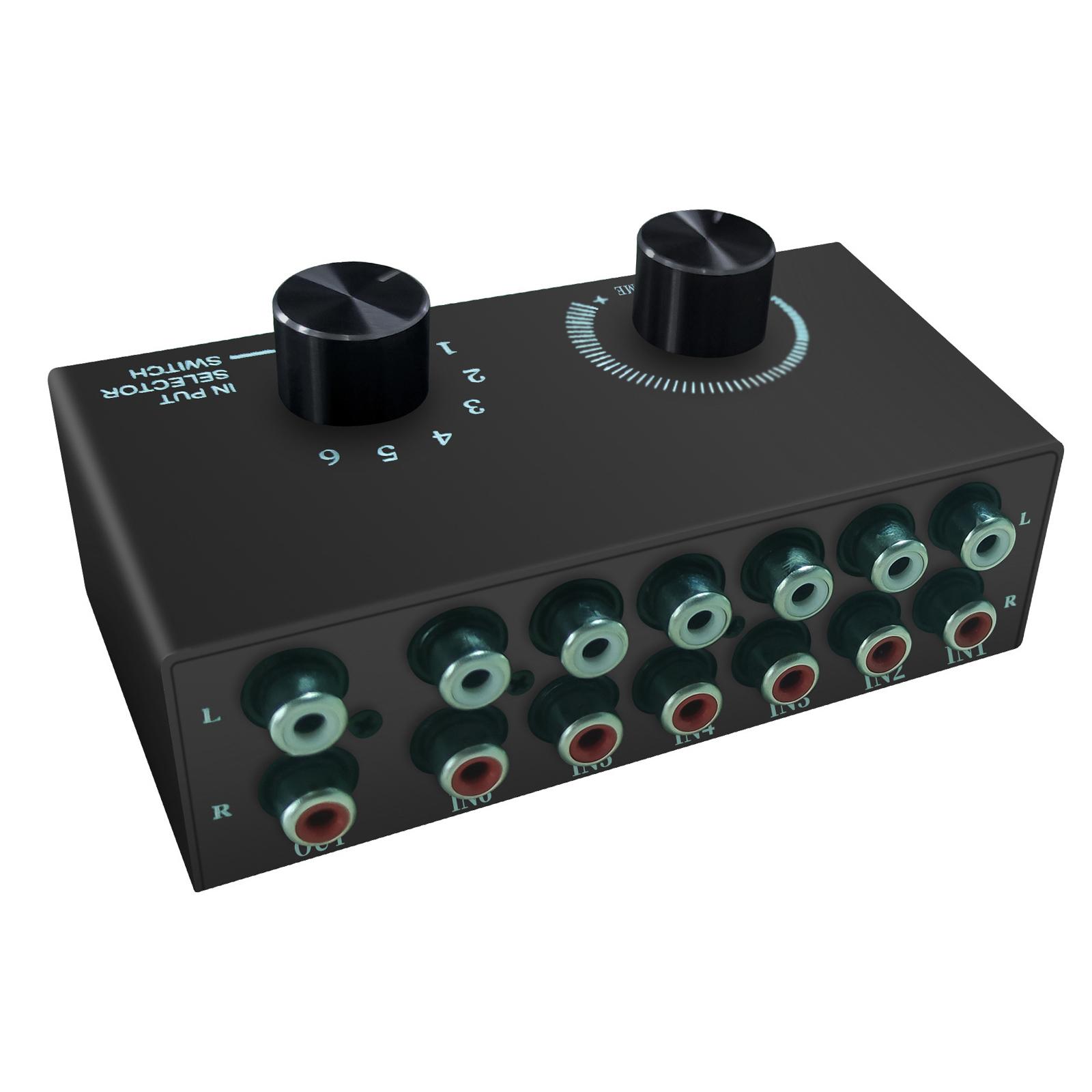 Amplificador de audio rca: 6 grupos de interfaz de entrada de fuente de señal rca estéreo, puerto de audio de canal l/r de 6 entradas y 1 salida.