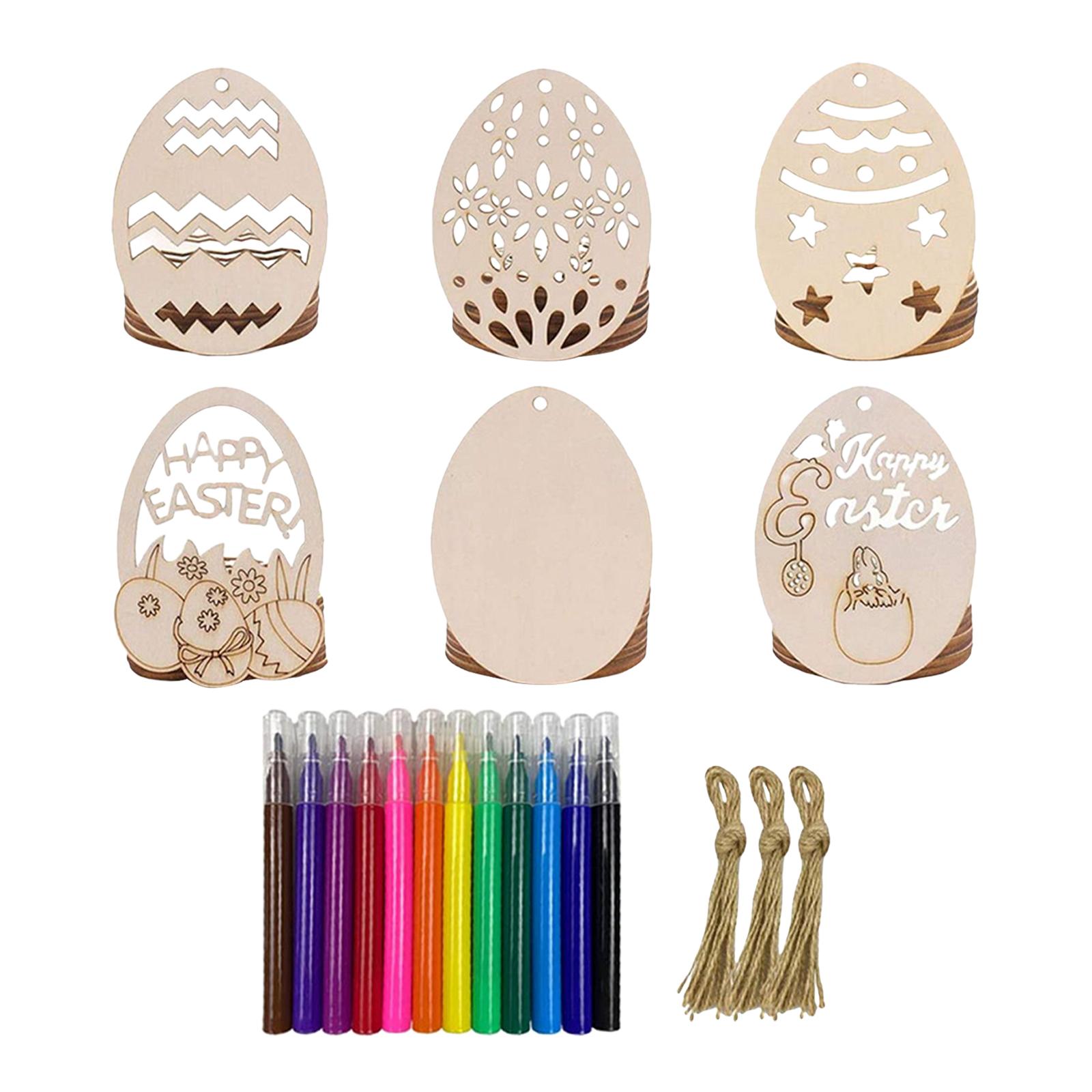Adornos de madera: 30 adornos de pascua de madera (6 formas), cada forma es de 5 piezas, 30 cuerdas, 12 marcadores de color, suficientes para cualquier proyecto de manualidades que tenga, ideal para colgar en su pascua.
