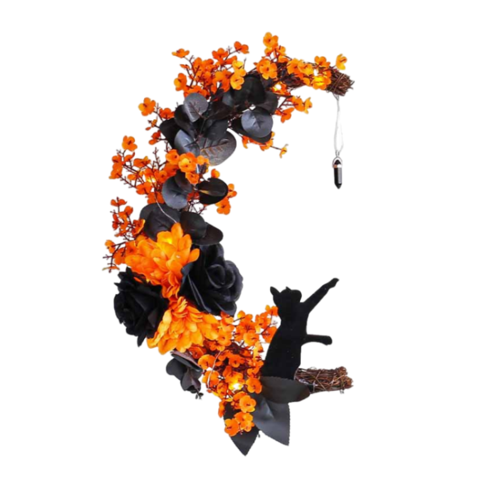 Adorno colgante: la corona de halloween en forma de luna, con una silueta clásica de gato negro y plantas simuladas, crea una atmósfera única de halloween en un estilo oscuro.