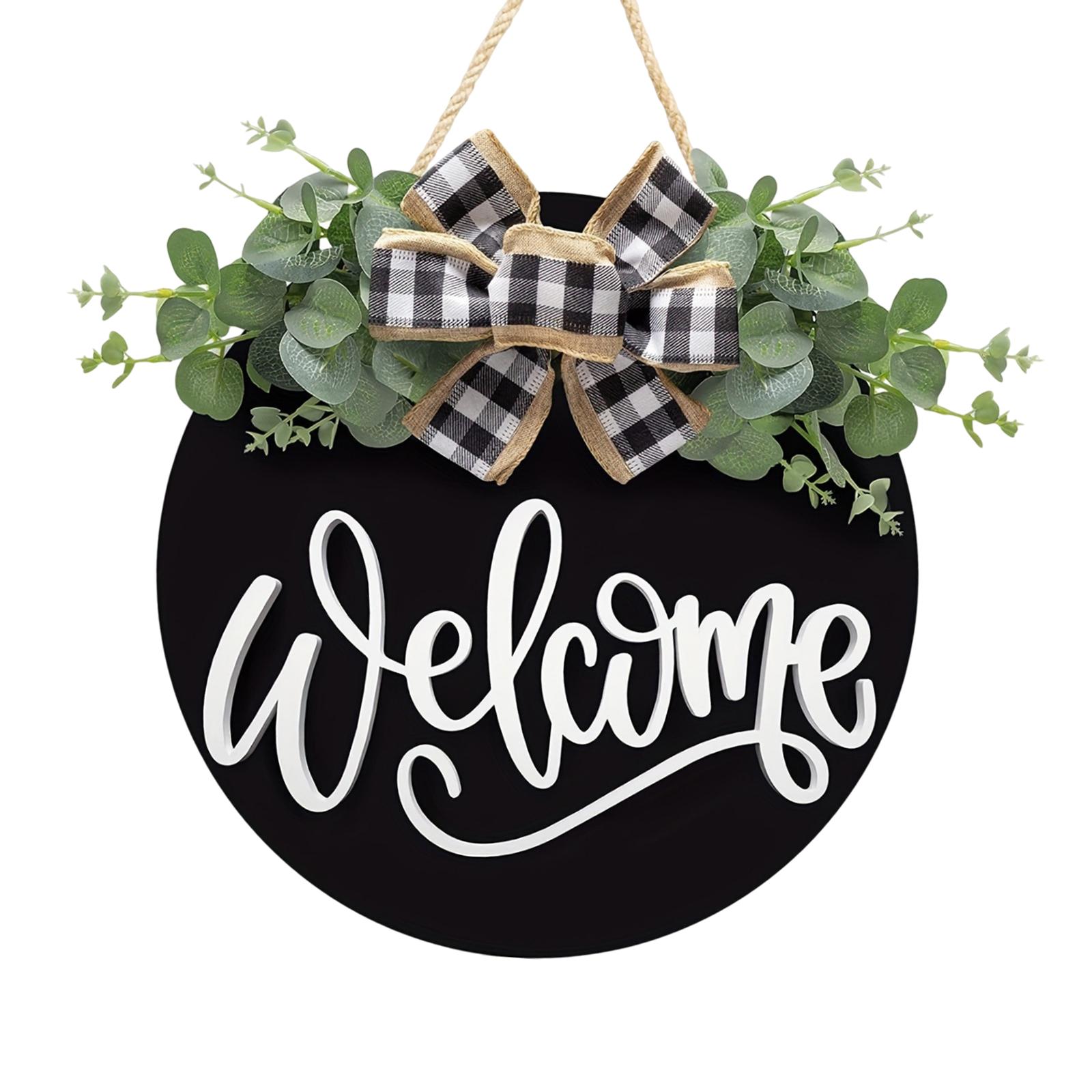 【decoración de puerta】: el cartel colgante de madera de bienvenida está decorado con un lazo y hojas artificiales, rústico y delicado, lo que hace que su puerta de entrada sea más atractiva.