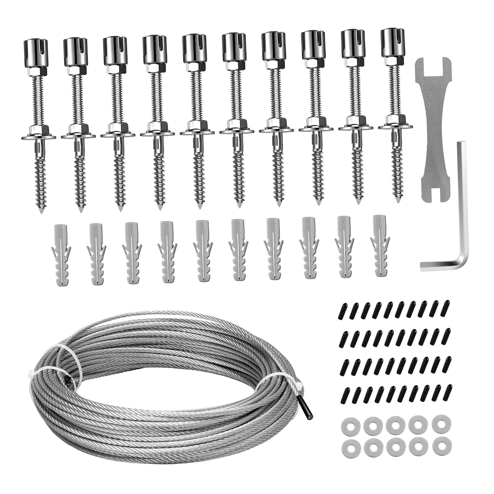 10 cubos de cruceta, 10 anclajes de expansión, 1 llave allen, 1 llave multiusos, 40 tapas de extremo de pvc, 10 arandelas, 1 rollo de alambre de 52 pies (diámetro de 1/8 de pulgada)