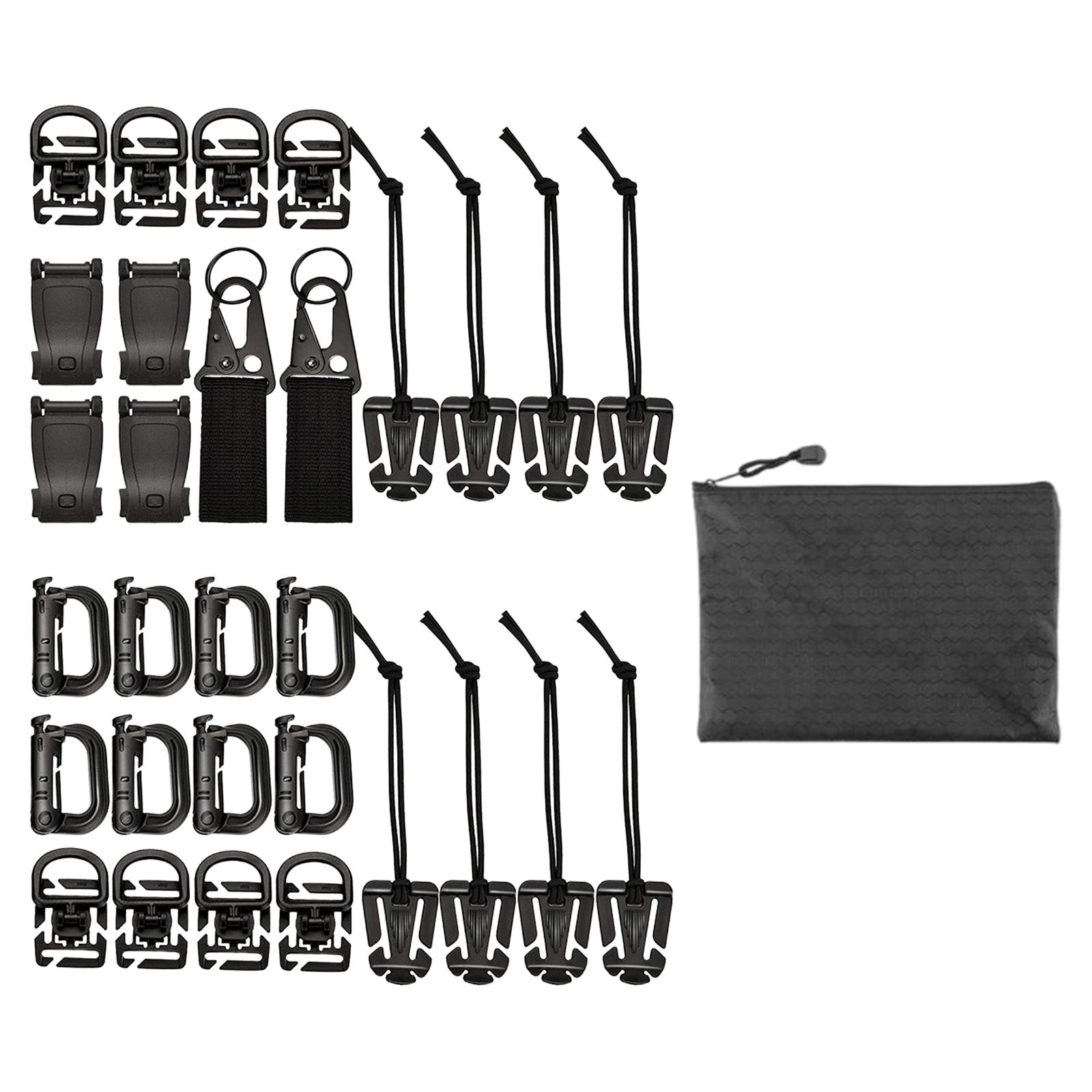 El paquete incluye: 8 ganchos para colgar con cierre de anillo en d, 8 clips de tubo de hidratación de equipo táctico, 8 clips de anillo en d de rotación de 360°, 4 hebillas web dominator, 2 llaveros de cincha molle, 1 bolsa de almacenamiento.