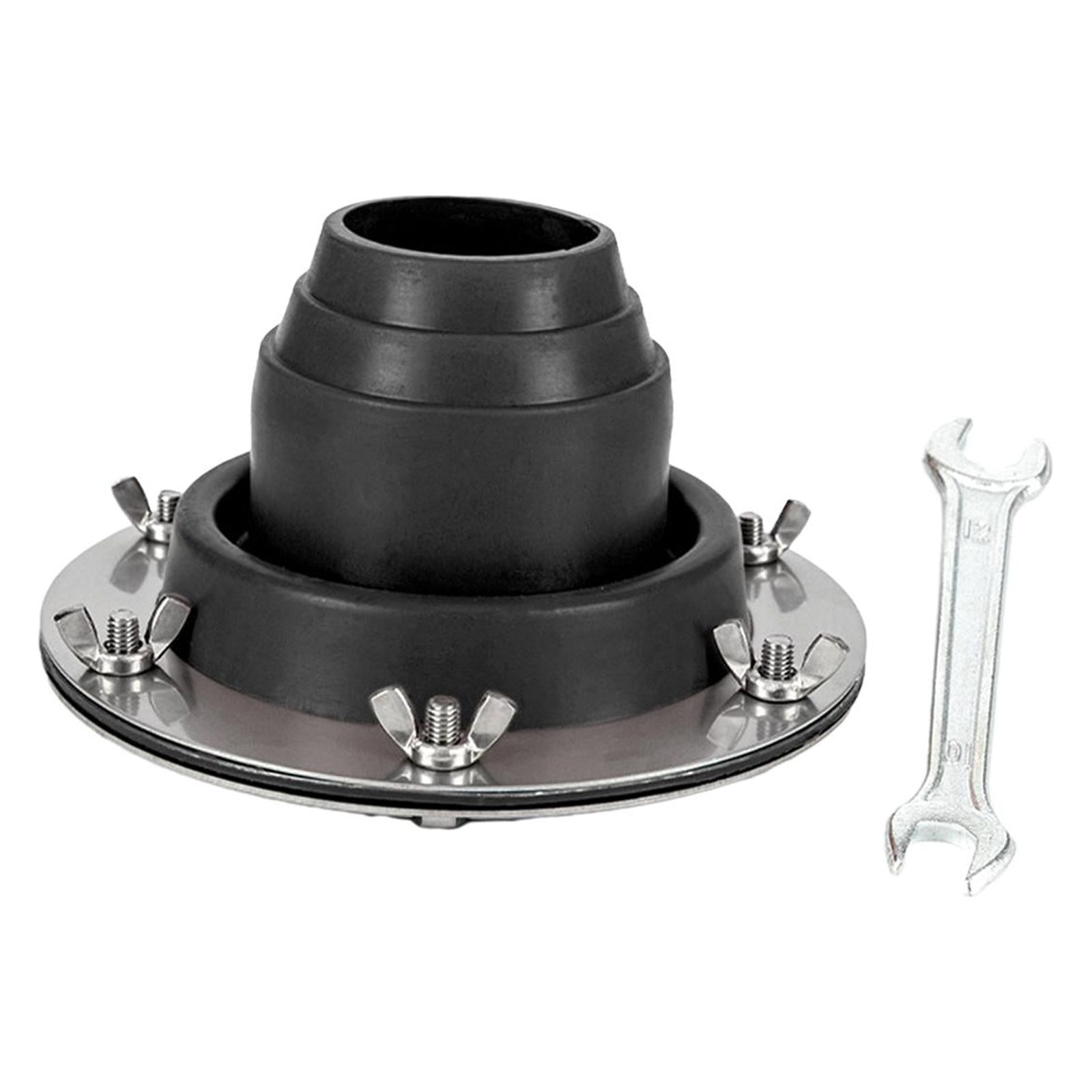 Tamaño: el diámetro de la base es de 6.3". se adapta a tubos de 1.8" a 3.9" de diámetro exterior. el paquete incluye 1 gato para estufa de tienda y 1 llave.