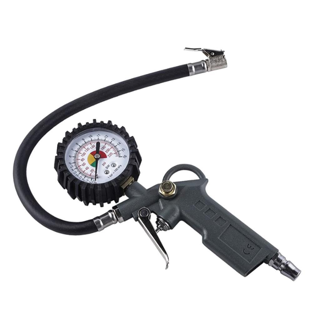 Medidor de presión de neumáticos de tubo largo universal: puede desinflar, inflar y probar los neumáticos de los vehículos, y también se puede conectar a una bomba de aire y tiene la función de soplar polvo en los motores de los vehículos.